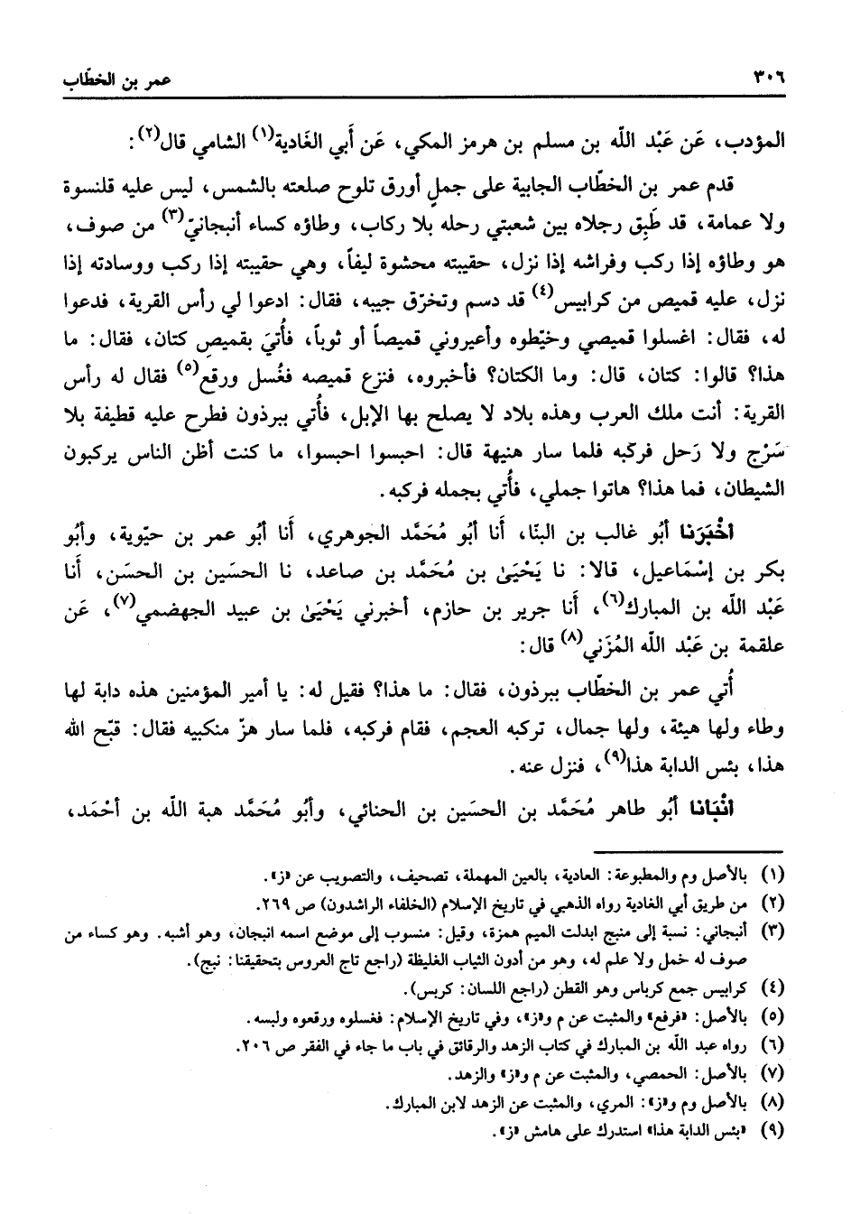 المؤدب عن عبد الله بن مسلم بن هرمز المكي عن أبي الغادية (1) الشامي قال (2) قدم عمر بن الخطاب الجابية على جمل أورق تلوح صلعته بالشمس ليس عليه قلنسوة ولا عمامة قد طبق رجلاه بين شعبتي رحله بلا ركاب وطاؤه كساء أنبجاني (3) من صوف هو وطاؤه إذا ركب وفراشه إذا نزل حقيبته محشوة ليفا وهي حقيبته إذا ركب ووسادته إذا نزل عليه قميص من كرابيس (4) قد دسم وتخرق جيبه فقال ادعوا لي رأس القرية فدعوا له فقال اغسلوا قميصي وخيطوه وأعيروني قميصا أو ثوبا فأتي بقميص كتان فقال ما هذا قالوا كتان قال وما الكتان فأخبروه فنزع قميصه فغسل ورقع (5) فقال له رأس القرية أنت ملك العرب وهذه بلاد لا يصلح بها الإبل فأتي ببرذون فطرح عليه قطيفة بلا سرج ولا رحل فركبه فلما سار هنيهة قال احبسوا احبسوا ما كنت أظن الناس يركبون الشيطان فما هذا هاتوا جملي فأتي بجمله فركبه أخبرنا أبو غالب بن البنا أنا أبو محمد الجوهري أنا أبو عمر بن حيوية وأبو بكر بن إسماعيل قالا نا يحيى بن محمد بن صاعد نا الحسين بن الحسن أنا عبد الله بن المبارك (6) أنا جرير بن حازم أخبرني يحيى بن عبيد الجهضمي (7) عن علقمة بن عبد الله المزني (8) قال أتي عمر بن الخطاب ببرذون فقال ما هذا فقيل له يا أمير المؤمنين هذه دابة لها وطاء ولها هيئة ولها جمال تركبه العجم فقام فركبه فلما سار هز منكبيه فقال قبح الله هذا بئس الدابة هذا (9) فنزل عنه أنبأنا أبو طاهر محمد بن الحسين بن الحنائي وأبو محمد هبة الله بن أحمد