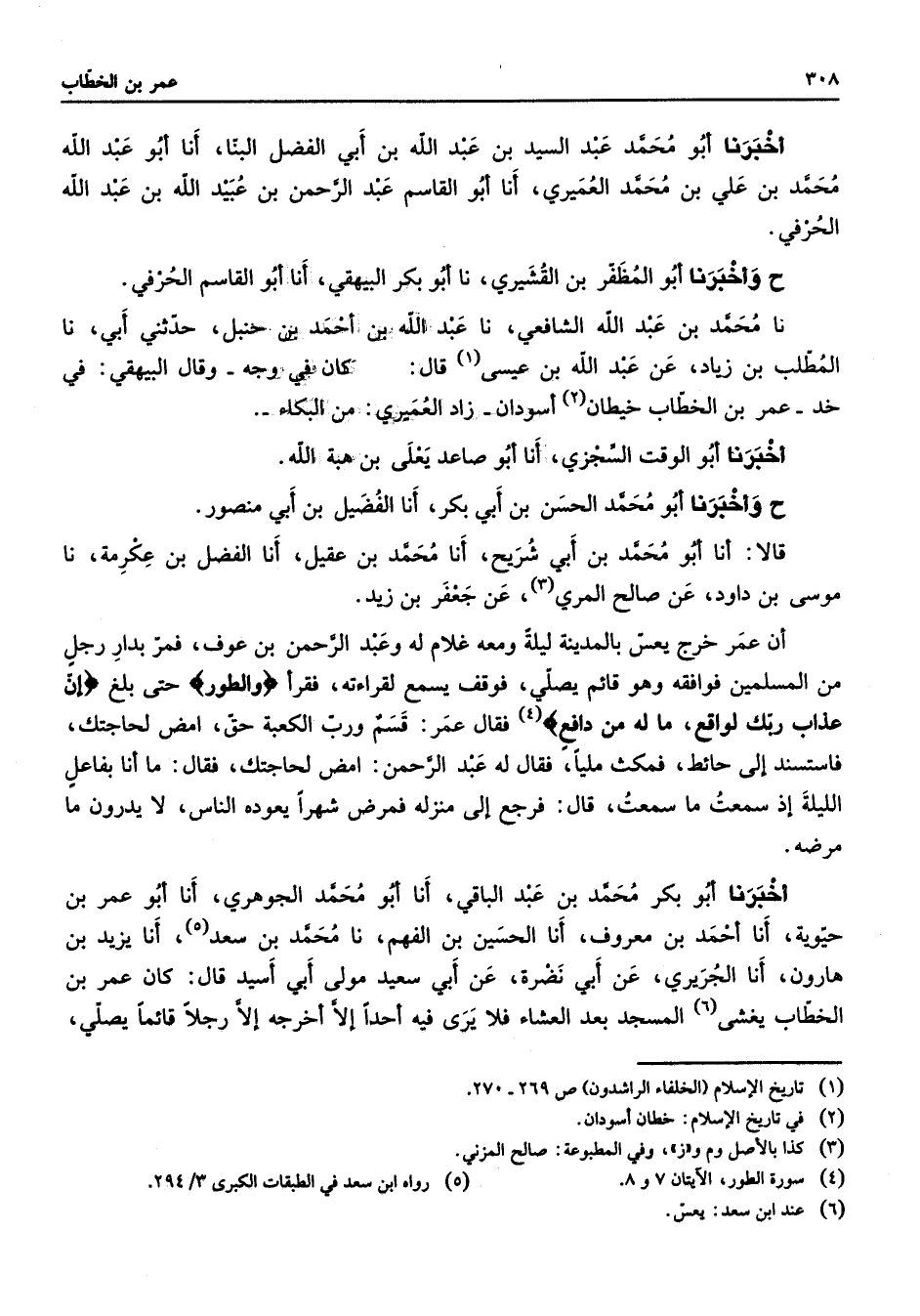 أخبرنا أبو محمد عبد السيد بن عبد الله بن أبي الفضل البنا أنا أبو عبد الله محمد بن علي بن محمد العميري أنا أبو القاسم عبد الرحمن بن عبيد الله بن عبد الله الحرفي ح وأخبرنا أبو المظفر بن القشيري نا أبو بكر البيهقي أنا أبو القاسم الحرفي نا محمد بن عبد الله الشافعي نا عبد الله بن أحمد بن حنبل حدثني أبي نا المطلب بن زياد عن عبد الله بن عيسى (1) قال كان في وجه وقال البيهقي في خد عمر بن الخطاب خيطان (2) أسودان زاد العميري من البكاء أخبرنا أبو الوقت السجزي أنا أبو صاعد يعلى بن هبة الله ح وأخبرنا أبو محمد الحسن بن أبي بكر أنا الفضيل بن أبي منصور قالا أنا أبو محمد بن أبي شريح أنا محمد بن عقيل أنا الفضل بن عكرمة نا موسى بن داود عن صالح المري (3) عن جعفر بن زيد أن عمر خرج يعس بالمدينة ليلة ومعه غلام له وعبد الرحمن بن عوف فمر بدار رجل من المسلمين فوافقه وهو قائم يصلي فوقف يسمع لقراءته فقرأ " والطور " حتى بلغ " إن عذاب ربك لواقع ما له من دافع " (4) فقال عمر قسم ورب الكعبة حق امض لحاجتك فاستسند إلى حائط فمكث مليا فقال له عبد الرحمن امض لحاجتك فقال ما أنا بفاعل الليلة إذ سمعت ما سمعت قال فرجع إلى منزله فمرض شهرا يعوده الناس لا يدرون ما مرضه أخبرنا أبو بكر محمد بن عبد الباقي أنا أبو محمد الجوهري أنا أبو عمر بن حيوية أنا أحمد بن معروف أنا الحسين بن الفهم نا محمد بن سعد (5) أنا يزيد بن هارون أنا الجريري عن أبي نضرة عن أبي سعيد مولى أبي أسيد قال كان عمر بن الخطاب يغشى (6) المسجد بعد العشاء فلا يرى فيه أحدا إلا أخرجه إلا رجلا قائما يصلي