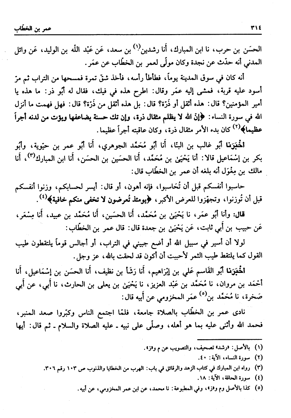 الحسن بن حرب نا ابن المبارك أنا رشدين (1) بن سعد عن عبد الله بن الوليد عن وائل المدني أنه حدث عن نجدة وكان مولى لعمر بن الخطاب عن عمر أنه كان في سوق المدينة يوما فطأطأ رأسه فأخذ شق تمرة فمسحها من التراب ثم مر أسود عليه قربة فمشى إليه عمر وقال اطرح هذه في فيك فقال له أبو ذر ما هذه يا أمير المؤمنين قال هذه أثقل أو ذرة قال بل هذه أثقل من ذرة قال فهل فهمت ما أنزل الله في سورة النساء " إن الله لا يظلم مثقال ذرة وإن تك حسنة يضاعفها ويؤت من لدنه أجرا عظيما (2) كان بدء الأمر مثقال ذرة وكان عاقبته أجرا عظيما أخبرنا أبو غالب بن البنا أنا أبو محمد الجوهري أنا أبو عمر بن حيوية وأبو بكر بن إسماعيل قالا أنا يحيى بن محمد أنا الحسين بن الحسن أنا ابن المبارك (3) أنا مالك بن مغول أنه بلغه أن عمر بن الخطاب قال حاسبوا أنفسكم قبل أن تحاسبوا فإنه أهون أو قال أيسر لحسابكم وزنوا أنفسكم قبل أن توزنوا وتجهزوا للعرض الأكبر " يومئذ تعرضون لا تخفى منكم خافية " (4) قال وأنا أبو عمر نا يحيى بن محمد أنا الحسين أنا محمد بن عبيد أنا مسعر عن حبيب بن أبي ثابت عن يحيى بن جعدة قال قال عمر بن الخطاب لولا أن أسير في سبيل الله أو أضع جبيني في التراب أو أجالس قوما يلتقطون طيب القول كما يلتقط طيب الثمر لأحببت أن أكون قد لحقت بالله عز وجل أخبرنا أبو القاسم علي بن إبراهيم أنا رشأ بن نظيف أنا الحسن بن إسماعيل أنا أحمد بن مروان نا محمد بن عبد العزيز نا يحيى بن يعلى بن الحارث نا أبي عن أبي صخرة نا محمد بن (5) عمر المخزومي عن أبيه قال نادى عمر بن الخطاب بالصلاة جامعة فلما اجتمع الناس وكبروا صعد المنبر فحمد الله وأثنى عليه بما هو أهله وصلى على نبيه عليه الصلاة والسلام ثم قال أيها