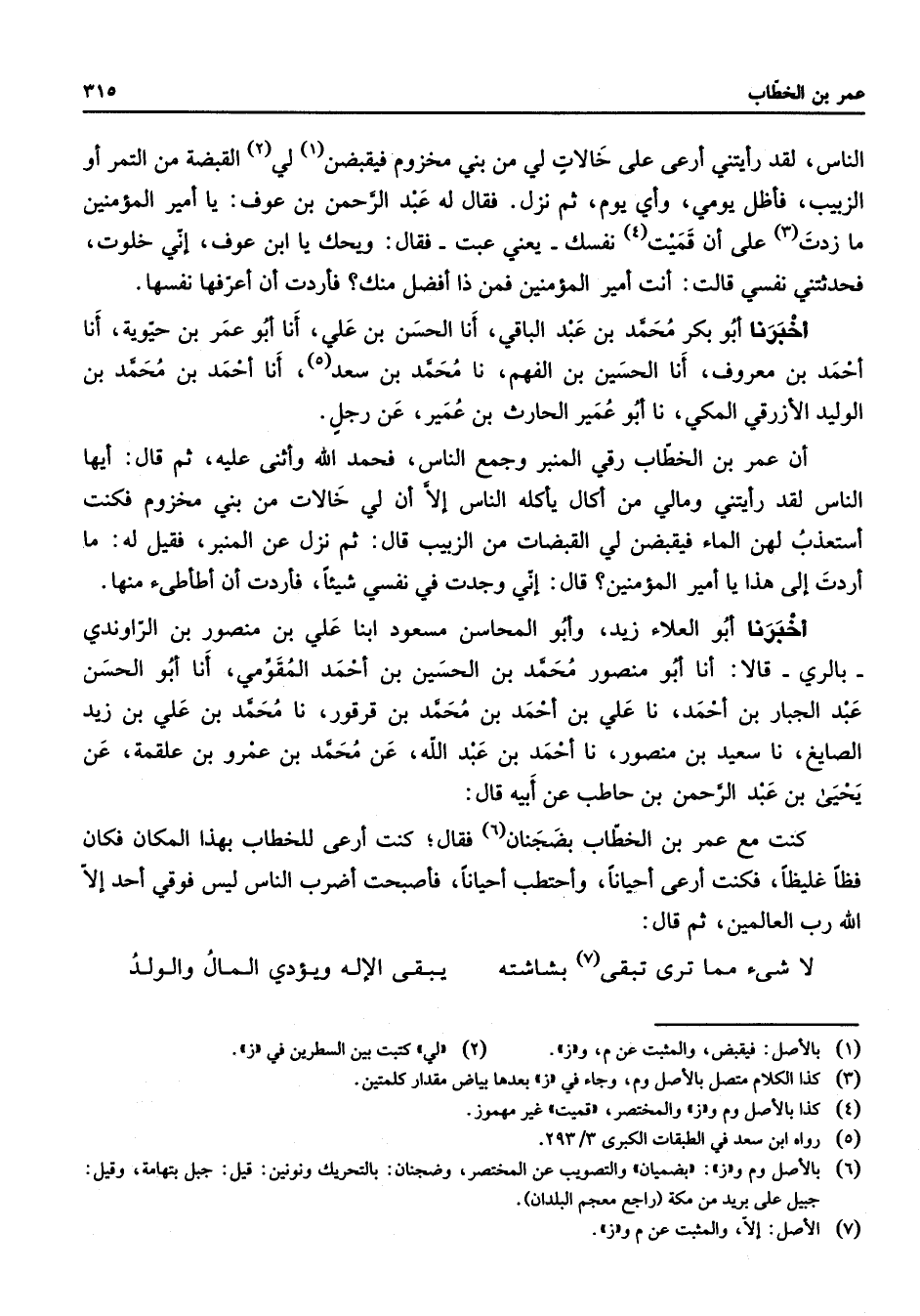 الناس لقد رأيتني أرعى على خالات لي من بني مخزوم فيقبضن (1) لي (2) القبضة من التمر أو الزبيب فأظل يومي وأي يوم ثم نزل فقال له عبد الرحمن بن عوف يا أمير المؤمنين ما زدت (3) على أن قميت (4) نفسك يعني عبت فقال ويحك يا ابن عوف إني خلوت فحدثتني نفسي قالت أنت أمير المؤمنين فمن ذا أفضل منك فأردت أن أعرفها نفسها " أخبرنا أبو بكر محمد بن عبد الباقي أنا الحسن بن علي أنا أبو عمر بن حيوية أنا أحمد بن معروف أنا الحسين بن الفهم نا محمد بن سعد (5) أنا أحمد بن محمد بن الوليد الأزرقي المكي نا أبو عمير الحارث بن عمير عن رجل أن عمر بن الخطاب رقي المنبر وجمع الناس فحمد الله وأثنى عليه ثم قال أيها الناس لقد رأيتني ومالي من أكال يأكله الناس إلا أن لي خالات من بني مخزوم فكنت أستعذب لهن الماء فيقبضن لي القبضات من الزبيب قال ثم نزل عن المنبر فقيل له ما أردت إلى هذا يا أمير المؤمنين قال إني وجدت في نفسي شيئا فأردت أن أطأطئ منها أخبرنا أبو العلاء زيد وأبو المحاسن مسعود ابنا علي بن منصور بن الراوندي بالري قالا أنا أبو منصور محمد بن الحسين بن أحمد المقومي أنا أبو الحسن عبد الجبار بن أحمد نا علي بن أحمد بن محمد بن قرقور نا محمد بن علي بن زيد الصايغ نا سعيد بن منصور نا أحمد بن عبد الله عن محمد بن عمرو بن علقمة عن يحيى بن عبد الرحمن بن حاطب عن أبيه قال كنت مع عمر بن الخطاب بضجنان (6) فقال كنت أرعى للخطاب بهذا المكان فكان فظا غليظا فكنت أرعى أحيانا وأحتطب أحيانا فأصبحت أضرب الناس ليس فوقي أحد إلا الله رب العالمين ثم قال: لا شي مما ترى تبقى (7) بشاشته * يبقى الإله ويؤدي المال والولد