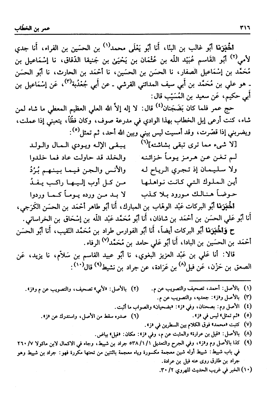 أخبرنا أبو غالب بن البنا أنا أبو يعلى محمد (1) بن الحسين بن الفراء أنا جدي لأمي (2) أبو القاسم عبيد الله بن عثمان بن يحيى بن جنيقا الدقاق نا إسماعيل بن محمد بن إسماعيل الصفار نا الحسن بن الحسين نا أحمد بن الحارث نا أبو الحسن هو علي بن محمد بن أبي سيف المدائني القرشي عن أبي جعدبة (3) عن إسماعيل بن أبي حكيم عن سعيد بن المسيب قال حج عمر فلما كان بضجنان (4) قال لا إله إلا الله العلي العظيم المعطي ما شاء لمن شاء كنت أرعى إبل الخطاب بهذا الوادي في مدرعة صوف وكان فظا يتعبني إذا عملت ويضربني إذا قصرت وقد أمسيت ليس بيني وبين الله أحد ثم تمثل (5) : لا شئ مما ترى تبقى بشاشته (6) * يبقى الإله ويودي المال والولد لم تغن عن هرمز يوما خزائنه * والخلد قد حاولت عاد فما خلدوا ولا سليمان إذ تجري الرياح له * والأنس والجن فيما بينهم برد أين الملوك التي كانت نواهلها * من كل أوب إليها راكب يفد حوضا هنالك مورود بلا كذب * لا بد من ورده يوما كما وردوا أخبرنا أبو البركات عبد الوهاب بن المبارك أنا أبو طاهر أحمد بن الحسن الكرجي أنا أبو علي الحسن بن أحمد بن شاذان أنا أبو محمد عبد الله بن إسحاق بن الخراساني ح وأخبرنا أبو البركات أيضا أنا أبو الفوارس طراد بن محمد النقيب أنا أبو الحسن أحمد بن الحسين بن البادا أنا أبو علي حامد بن محمد (7) الرفاء قالا أنا علي بن عبد العزيز البغوي نا أبو عبيد القاسم بن سلام نا يزيد عن الصعق بن حزم عن فيل (8) بن عرادة عن جراد بن نشيط (9) قال (10)