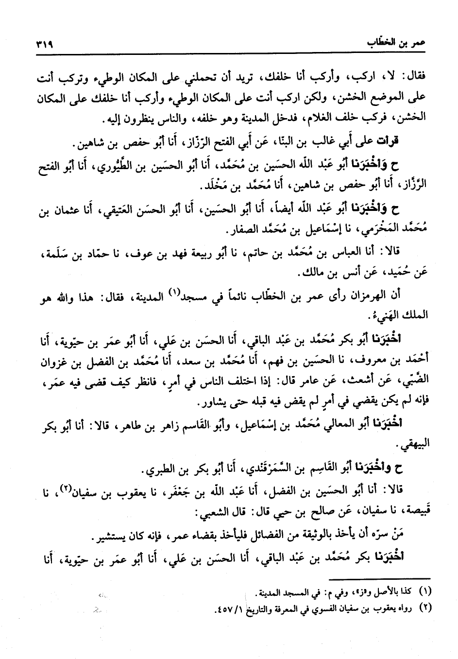فقال لا اركب وأركب أنا خلفك تريد أن تحملني على المكان الوطئ وتركب أنت على الموضع الخشن ولكن اركب أنت على المكان الوطئ وأركب أنا خلفك على المكان الخشن فركب خلف الغلام فدخل المدينة وهو خلفه والناس ينظرون إليه قرأت على أبي غالب بن البنا عن أبي الفتح الرزاز أنا أبو حفص بن شاهين ح وأخبرنا أبو عبد الله الحسين بن محمد أنا أبو الحسين بن الطيوري أنا أبو الفتح الرزاز أنا أبو حفص بن شاهين أنا محمد بن مخلد ح وأخبرنا أبو عبد الله أيضا أنا أبو الحسين أنا أبو الحسن العتيقي أنا عثمان بن محمد المخرمي نا إسماعيل بن محمد الصفار قالا أنا العباس بن محمد بن حاتم نا أبو ربيعة فهد بن عوف نا حماد بن سلمة عن حميد عن أنس بن مالك أن الهرمزان رأى عمر بن الخطاب نائما في مسجد (1) المدينة فقال هذا والله هو الملك الهنئ أخبرنا أبو بكر محمد بن عبد الباقي أنا الحسن بن علي أنا أبو عمر بن حيوية أنا أحمد بن معروف نا الحسين بن فهم أنا محمد بن سعد أنا محمد بن الفضل بن غزوان الضبي عن أشعث عن عامر قال إذا اختلف الناس في أمر فانظر كيف قضى فيه عمر فإنه لم يكن يقضي في أمر لم يقض فيه قبله حتى يشاور أخبرنا أبو المعالي محمد بن إسماعيل وأبو القاسم زاهر بن طاهر قالا أنا أبو بكر البيهقي ح وأخبرنا أبو القاسم بن السمرقندي أنا أبو بكر بن الطبري قالا أنا أبو الحسين بن الفضل أنا عبد الله بن جعفر نا يعقوب بن سفيان (2) نا قبيصة نا سفيان عن صالح بن حيي قال قال الشعبي من سره أن يأخذ بالوثيقة من الفضائل فليأخذ بقضاء عمر فإنه كان يستشير أخبرنا بكر محمد بن عبد الباقي أنا الحسن بن علي أنا أبو عمر بن حيوية أنا
