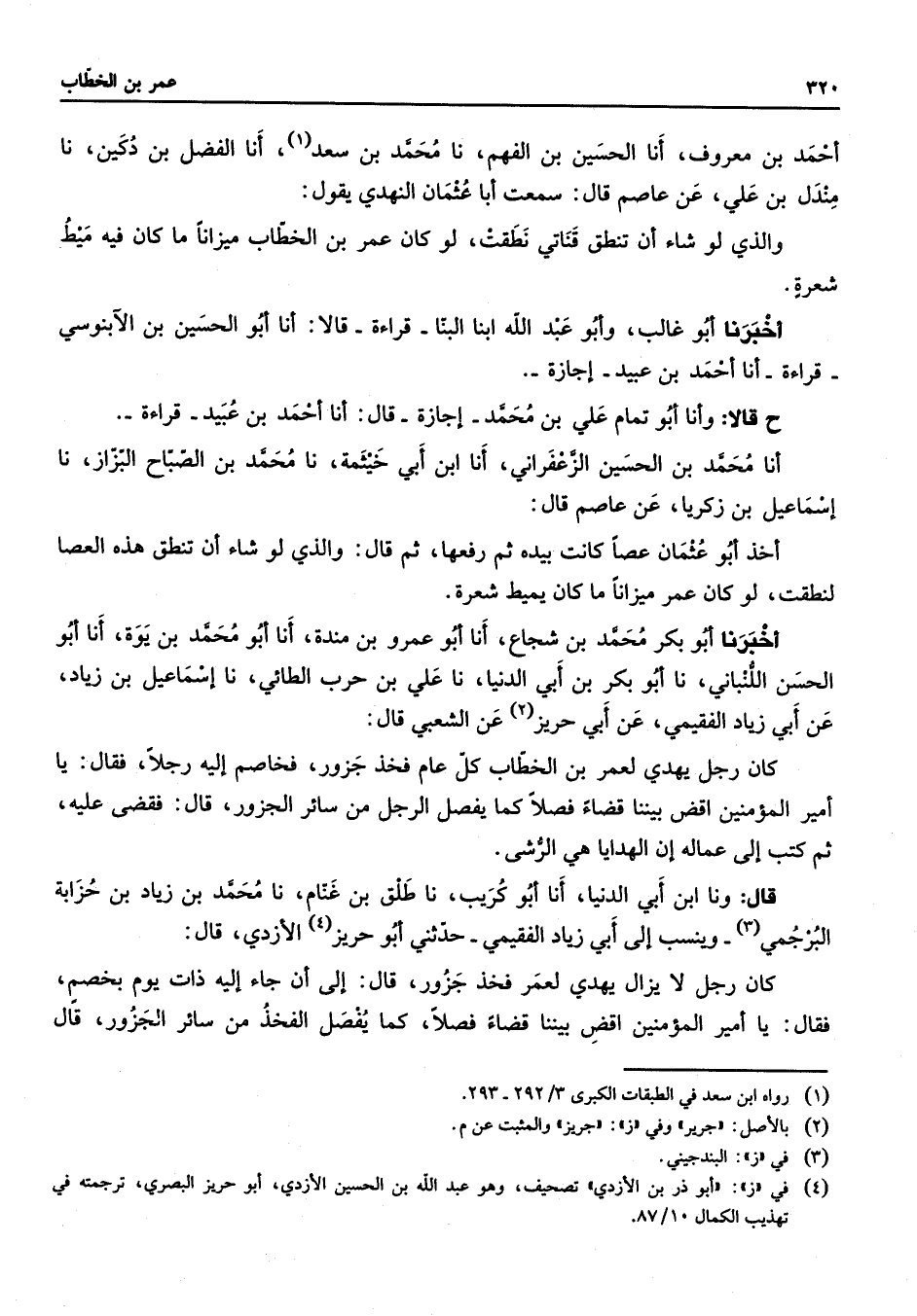 أحمد بن معروف أنا الحسين بن الفهم نا محمد بن سعد (1) أنا الفضل بن دكين نا مندل بن علي عن عاصم قال سمعت أبا عثمان النهدي يقول والذي لو شاء أن تنطق قناتي نطقت لو كان عمر بن الخطاب ميزانا ما كان فيه ميط شعره أخبرنا أبو غالب وأبو عبد الله أبنا البنا قراءة قالا أنا أبو الحسين بن الآبونيسي قراءة أنا أحمد بن عبيد إجازة ح قالا وأنا أبو تمام علي بن محمد إجازة قال أنا أحمد بن عبيد قراءة أنا محمد بن الحسين الزعفراني أنا ابن أبي خيثمة نا محمد بن الصباح البزاز نا إسماعيل بن زكريا عن عاصم قال أخذ أبو عثمان عصا كانت بيده ثم رفعها ثم قال والذي لو شاء أن تنطق هذه العصا لنطقت لو كان عمر ميزانا ما كان يميط شعرة أخبرنا أبو بكر محمد بن شجاع أنا أبو عمرو بن مندة أنا أبو محمد بن يوة أنا أبو الحسن اللنباني نا أبو بكر بن أبي الدنيا نا علي بن حرب الطائي نا إسماعيل بن زياد عن أبي زياد الفقيمي عن أبي حريز (2) عن الشعبي قال كان رجل يهدي لعمر بن الخطاب كل عام فخذ جزور فخاصم إليه رجلا فقال يا أمير المؤمنين اقض بيننا قضاء فصلا كما يفصل الرجل من سائر الجزور قال فقضى عليه ثم كتب إلى عماله إن الهدايا هي الرشى قال ونا ابن أبي الدنيا أنا أبو كريب نا طلق بن غنام نا محمد بن زياد بن حزابة البرجمي (3) وينسب إلى أبي زياد الفقيمي حدثني أبو حريز (4) الأزدي قال كان رجل لا يزال يهدي لعمر فخذ جزور قال إلى أن جاء إليه ذات يوم بخصم فقال يا أمير المؤمنين اقض بيننا قضاء فصلا كما يفصل الفخذ من سائر الجزور قال