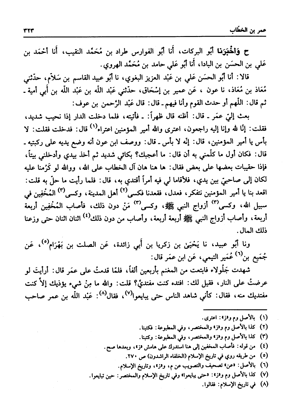 ح وأخبرنا أبو البركات أنا أبو الفوارس طراد بن محمد النقيب أنا أحمد بن علي بن الحسن بن البادا أنا أبو علي حامد بن محمد الهروي قالا أنا أبو الحسن علي بن عبد العزيز البغوي نا أبو عبيد القاسم بن سلام حدثني معاذ بن معاذ نا عون عن عمير بن إسحاق حدثني عبد الله بن عبد الله بن أبي أمية ثم قال اللهم أو حدث القوم وأنا فيهم قال قال عبد الرحمن بن عوف بعث إلي عمر قال أظنه قال ظهرا فأتيته فلما دخلت الدار إذا نحيب شديد فقلت إنا لله وإنا إليه راجعون اعترى والله أمير المؤمنين اعتراء (1) قال فدخلت فقلت لا بأس يا أمير المؤمنين قال إنه لا بأس قال ووصف ابن عون أنه وضع يديه على ركبتيه قال فكان أول ما كلمني به أن قال ما أعجبك بكائي شديد ثم أخذ بيدي وأدخلني بيتا فإذا حقيبات بعضها على بعض فقال ها هنا هان آل الخطاب على الله ووالله لو كرمنا عليه لكان إلى صاحبي بين يدي فلأقاما لي فيه أمرا أقتدي به قال فلما رأيت ما حل به قلت اقعد بنا يا أمير المؤمنين نتفكر فعدل فقعدنا فكسى (2) أهل المدينة وكسى (3) المخفين في سبيل الله وكسى (3) أزواج النبي (صلى الله عليه وسلم) وكسى (3) من دون ذلك فأصاب المخفين أربعة أربعة وأصاب أزواج النبي (صلى الله عليه وسلم) أربعة أربعة وأصاب من دون ذلك (4) اثنان اثنان حتى وزعنا ذلك المال ونا أبو عبيد نا يحيى بن زكريا بن أبي زائدة عن الصلت بن بهرام (5) عن جميع بن (6) عمير التيمي عن ابن عمر قال