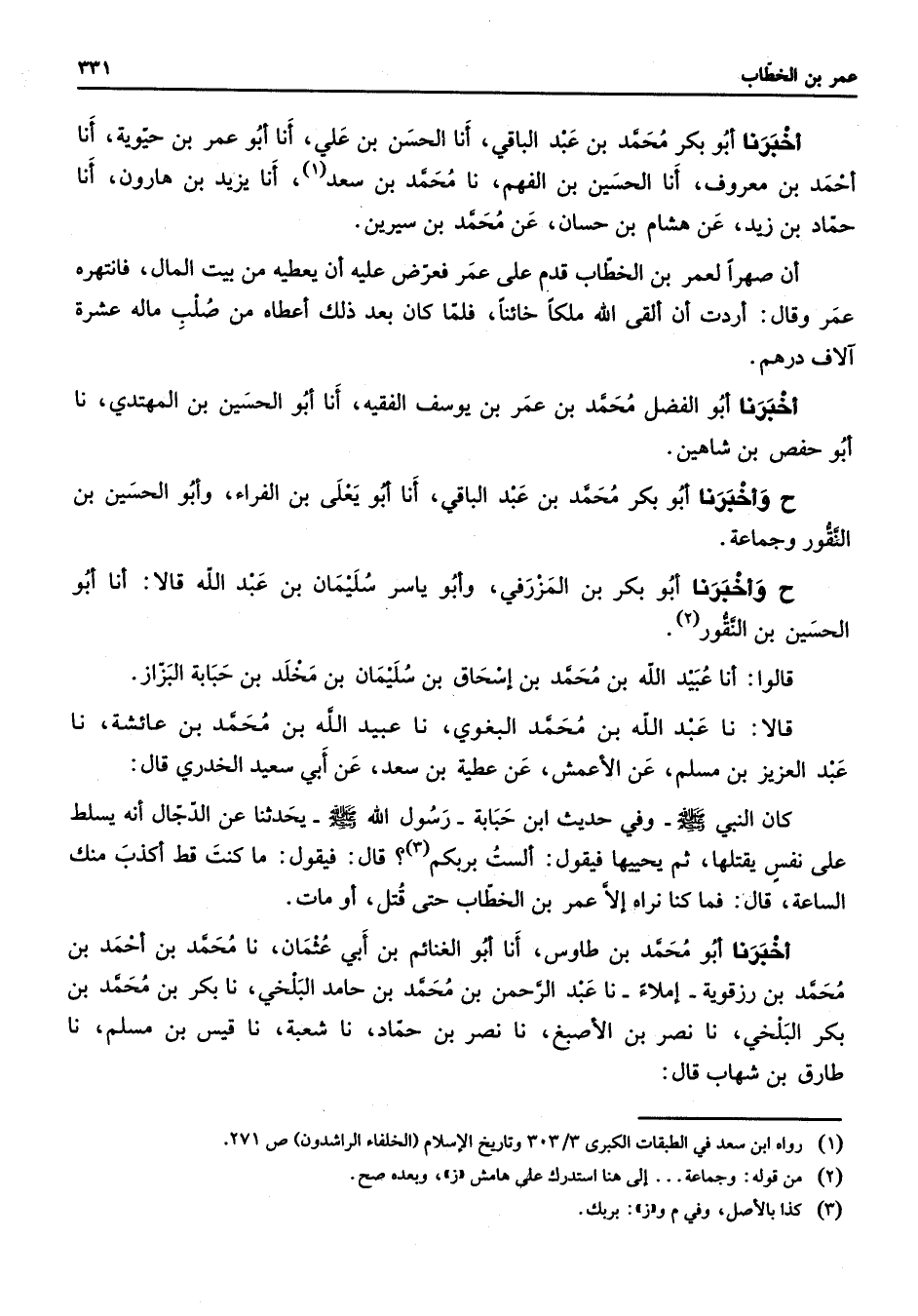 (1) رواه ابن سعد في الطبقات الكبرى 3 / 303 وتاريخ الاسلام (الخلفاء الراشدون) ص 271