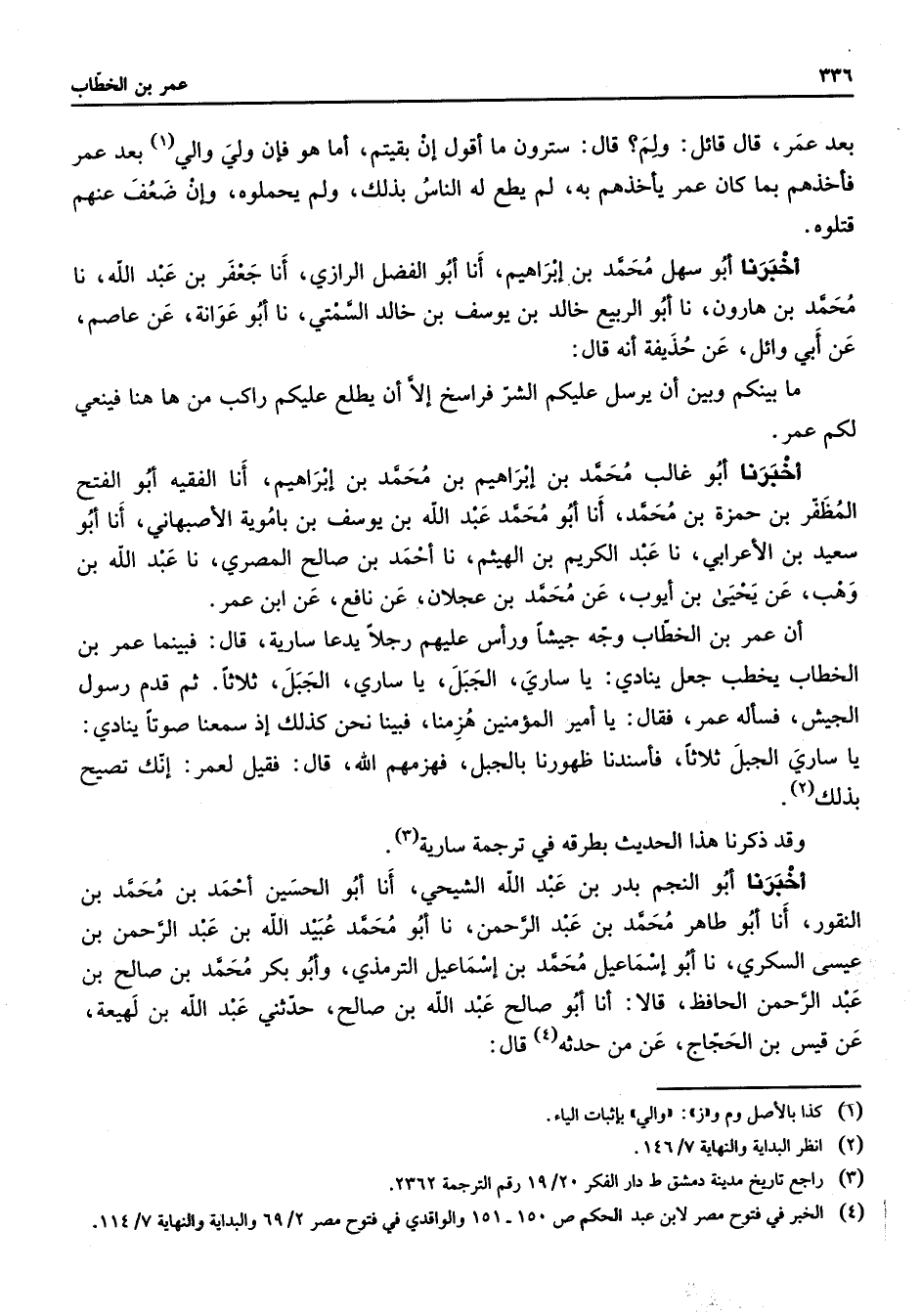 بعد عمر قال قائل ولم قال سترون ما أقول إن بقيتم أما هو فإن ولي والي (1) بعد عمر فأخذهم بما كان عمر يأخذهم به لم يطع له الناس بذلك ولم يحملوه وإن ضعف عنهم قتلوه أخبرنا أبو سهل محمد بن إبراهيم أنا أبو الفضل الرازي أنا جعفر بن عبد الله نا محمد بن هارون نا أبو الربيع خالد بن يوسف بن خالد السمتي نا أبو عوانة عن عاصم عن أبي وائل عن حذيفة أنه قال ما بينكم وبين أن يرسل عليكم الشر فراسخ إلا أن يطلع عليكم راكب من ها هنا فينعي لكم عمر أخبرنا أبو غالب محمد بن إبراهيم بن محمد بن إبراهيم أنا الفقيه أبو الفتح المظفر بن حمزة بن محمد أنا أبو محمد عبد الله بن يوسف بن باموية الأصبهاني أنا أبو سعيد بن الأعرابي نا عبد الكريم بن الهيثم نا أحمد بن صالح المصري نا عبد الله بن وهب عن يحيى بن أيوب عن محمد بن عجلان عن نافع عن ابن عمر أن عمر بن الخطاب وجه جيشا ورأس عليهم رجلا يدعا سارية قال فبينما عمر بن الخطاب يخطب جعل ينادي يا ساري الجبل يا ساري الجبل ثلاثا ثم قدم رسول الجيش فسأله عمر فقال يا أمير المؤمنين هزمنا فبينا نحن كذلك إذ سمعنا صوتا ينادي يا ساري الجبل ثلاثا فأسندنا ظهورنا بالجبل فهزمهم الله قال فقيل لعمر إنك تصيح بذلك (2) وقد ذكرنا هذا الحديث بطرقه في ترجمة سارية (3) أخبرنا أبو النجم بدر بن عبد الله الشيحي أنا أبو الحسين أحمد بن محمد بن النقور أنا أبو طاهر محمد بن عبد الرحمن نا أبو محمد عبيد الله بن عبد الرحمن بن عيسى السكري نا أبو إسماعيل محمد بن إسماعيل الترمذي وأبو بكر محمد بن صالح بن عبد الرحمن الحافظ قالا أنا أبو صالح عبد الله بن صالح حدثني عبد الله بن لهيعة عن قيس بن الحجاج عن من حدثه (4) قال