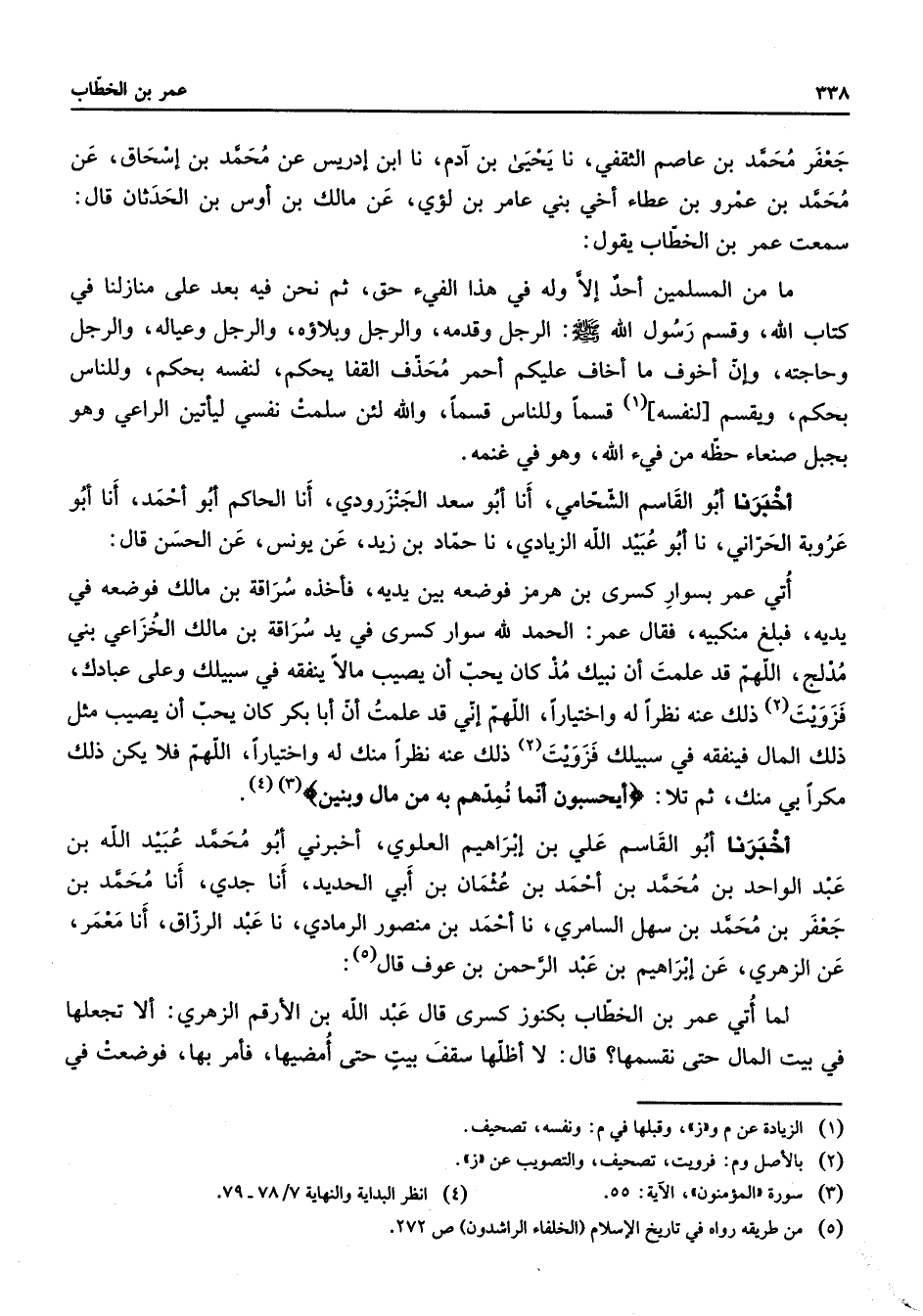 جعفر محمد بن عاصم الثقفي نا يحيى بن آدم نا ابن إدريس عن محمد بن إسحاق عن محمد بن عمرو بن عطاء أخي بني عامر بن لؤي عن مالك بن أوس بن الحدثان قال سمعت عمر بن الخطاب يقول ما من المسلمين أحد إلا وله في هذا الفئ حق ثم نحن فيه بعد على منازلنا في كتاب الله وقسم رسول الله (صلى الله عليه وسلم) الرجل وقدمه والرجل وبلاؤه والرجل وعياله والرجل وحاجته وإن أخوف ما أخاف عليكم أحمر محذف القفا يحكم لنفسه بحكم وللناس بحكم ويقسم لنفسه (1) قسما وللناس قسما والله لئن سلمت نفسي ليأتين الراعي وهو بجبل صنعاء حظه من في الله وهو في غنمه أخبرنا أبو القاسم الشحامي أنا أبو سعد الجنزرودي أنا الحاكم أبو أحمد أنا أبو عروبة الحراني نا أبو عبيد الله الزيادي نا حماد بن زيد عن يونس عن الحسن قال أتي عمر بسوار كسرى بن هرمز فوضعه بين يديه فأخذه سراقة بن مالك فوضعه في يديه فبلغ منكبيه فقال عمر الحمد لله سواء كسرى في يد سراقة بن مالك الخزاعي بني مدلج اللهم قد علمت أن نبيك مذ كان يحب أن يصيب مالا ينفقه في سبيلك وعلى عبادك فزويت (2) ذلك عنه نظرا له واختيارا اللهم إني قد علمت أن أبا بكر كان يحب أن يصيب مثل ذلك المال فينفقه في سبيلك فزويت (2) ذلك عنه نظرا منك له واختيارا اللهم فلا يكن ذلك مكرا بي منك ثم تلا " أيحسبون أنما نمدهم به من مال وبنين " (3) (4) أخبرنا أبو القاسم علي بن إبراهيم العلوي أخبرني أبو محمد عبيد الله بن عبد الواحد بن محمد بن أحمد بن عثمان بن أبي الحديد أنا جدي أنا محمد بن جعفر بن محمد بن سهل السامري نا أحمد بن منصور الرمادي نا عبد الرزاق أنا معمر عن الزهري عن إبراهيم بن عبد الرحمن بن عوف قال (5) لما أتي عمر بن الخطاب بكنوز كسرى قال عبد الله بن الأرقم الزهري ألا تجعلها في بيت المال حتى نقسمها قال لا أظلها سقف بيت حتى أمضيها فأمر بها فوضعت في