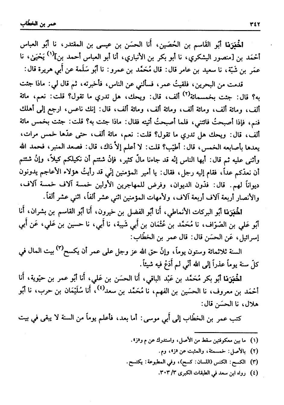 أخبرنا أبو القاسم بن الحصين أنا الحسن بن عيسى بن المقتدر نا أبو العباس أحمد بن منصور اليشكري نا أبو بكر بن الأنباري أنا أبو العباس أحمد بن (1) يحيى نا عمر بن شبة نا سعيد بن عامر قال قال محمد بن عمرو نا أبو سلمة عن أبي هريرة قال قدمت من البحرين فلقيت عمر فسألني عن الناس فأخبرته ثم قال لي ماذا جئت به قال جئت بخمسمائة (2) ألف قال ويحك هل تدري ما تقول قلت نعم مائة ألف ومائة ألف ومائة ألف ومائة ألف ومائة ألف قال إنك ناعس ارجع إلى أهلك فنم فإذا أصبحت فائتني فلما أصبحت أتيته فقال ماذا جئت به قلت جئت بخمس مائة ألف قال ويحك هل تدري ما تقول قلت نعم مائة ألف حتى عدها خمس مرات يعدها بأصابعه الخمس قال أطيب قلت لا أعلم إلا ذاك قال فصعد المنبر فحمد الله وأثنى عليه ثم قال أيها الناس إنه قد جاءنا مال كثير فإن شئتم أن نكيلكم كيلا وإن شئتم أن نعدكم عدا فقام إليه رجل فقال يا أمير المؤمنين إني قد رأيت هؤلاء الأعاجم يدونون ديوانا لهم قال فدون الديوان وفرض للمهاجرين الأولين خمسة آلاف خمسة آلاف والأنصار أربعة آلاف أربعة آلاف ولأمهات المؤمنين اثني عشر ألفا اثني عشر ألفا أخبرنا أبو البركات الأنماطي أنا أبو الفضل بن خيرون أنا أبو القاسم بن بشران أنا أبو علي بن الصواف نا محمد بن عثمان بن أبي شيبة نا أبي نا حسين بن علي عن أبي إسرائيل عن الحسن قال قال عمر بن الخطاب السنة ثلاثمائة وستون يوما وإن حق الله عز وجل على عمر أن يكسح (3) بيت المال في كل سنة يوما عذرا إلى الله أني لم أدع فيه شيئا أخبرنا أبو بكر محمد بن عبد الباقي أنا الحسن بن علي أنا أبو عمر بن حيوية أنا أحمد بن معروف نا الحسين بن الفهم نا محمد بن سعد أنا سليمان بن حرب نا أبو هلال نا الحسن قال كتب عمر بن الخطاب إلى أبي موسى أما بعد فأعلم يوما من السنة لا يبقى في بيت