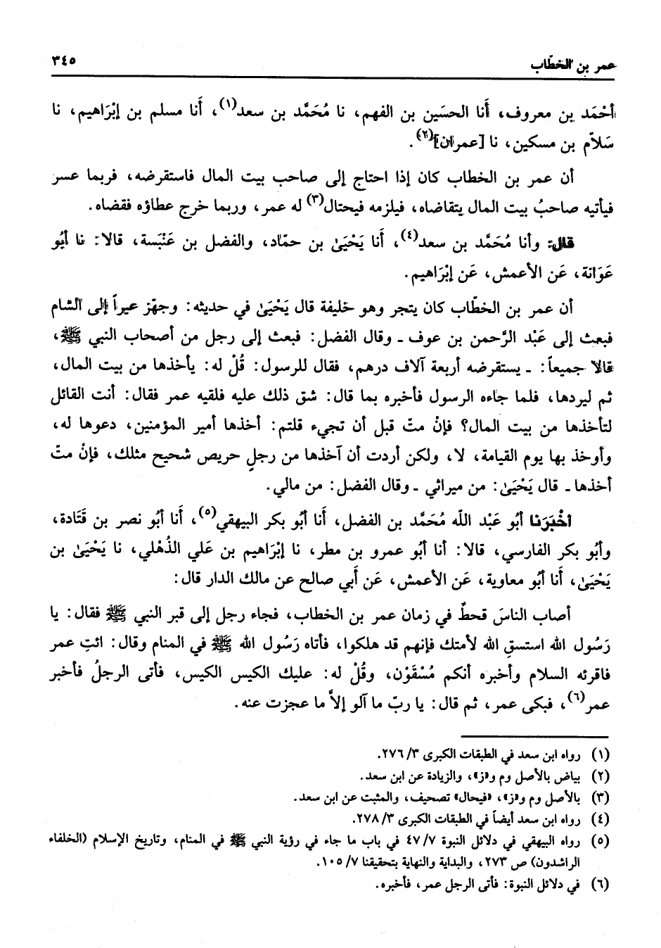 أحمد بن معروف أنا الحسين بن الفهم نا محمد بن سعد (1) أنا مسلم بن إبراهيم نا سلام بن مسكين نا عمران (2) أن عمر بن الخطاب كان إذا احتاج إلى صاحب بيت المال فاستقرضه فربما عسر فيأتيه صاحب بيت المال يتقاضاه فيلزمه فيحتال (3) له عمر وربما خرج عطاؤه فقضاه قال وأنا محمد بن سعد (4) أنا يحيى بن حماد والفضل بن عنبسة قالا نا أبو عوانة عن الأعمش عن إبراهيم أن عمر بن الخطاب كان يتجر وهو خليفة قال يحيى في حديثه وجهز عيرا إلى الشام فبعث إلى عبد الرحمن بن عوف وقال الفضل فبعث إلى رجل من أصحاب النبي (صلى الله عليه وسلم) قالا جميعا يستقرضه أربعة آلاف درهم فقال للرسول قل له يأخذها من بيت المال ثم ليردها فلما جاءه الرسول فأخبره بما قال شق ذلك عليه فلقيه عمر فقال أنت القائل لتأخذها من بيت المال فإن مت قبل أن تجئ قلتم أخذها أمير المؤمنين دعوها له وأوخذ بها يوم القيامة لا ولكن أردت أن آخذها من رجل حريص شحيح مثلك فإن مت أخذها قال يحيى من ميراثي وقال الفضل من مالي أخبرنا أبو عبد الله محمد بن الفضل أنا أبو بكر البيهقي (5) أنا أبو نصر بن قتادة وأبو بكر الفارسي قالا أنا أبو عمرو بن مطر نا إبراهيم بن علي الذهلي نا يحيى بن يحيى أنا معاوية عن الأعمش عن أبي صالح عن مالك الدار قال