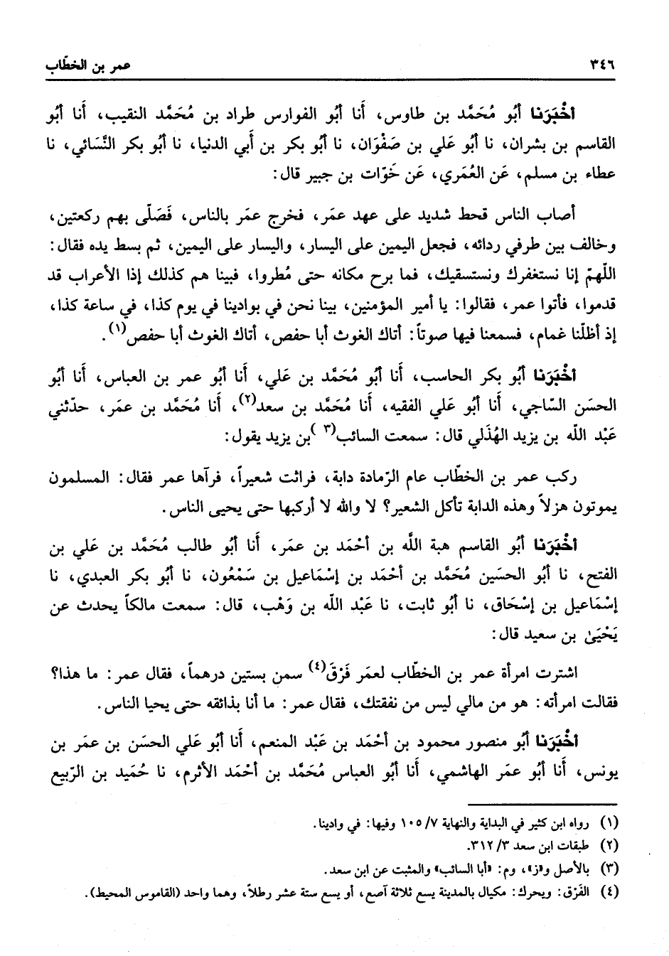 أخبرنا أبو محمد بن طاوس أنا أبو الفوارس طراد بن محمد النقيب أنا أبو القاسم بن بشران نا أبو علي بن صفوان نا أبو بكر بن أبي الدنيا نا أبو بكر النسائي نا عطاء بن مسلم عن العمري عن خوات بن جبير قال أصاب الناس قحط شديد على عهد عمر فخرج عمر بالناس فصلى بهم ركعتين وخالف بن طرفي ردائه فجعل اليمين على اليسار واليسار على اليمين ثم بسط يده فقال اللهم إنا نستغفرك ونستسقيك فما برح مكانه حتى مطروا فبينا هم كذلك إذا الأعراب قد قدموا فأتوا عمر فقالوا يا أمير المؤمنين بينا نحن في بوادينا في يوم كذا في ساعة كذا إذ أظلنا غمام فسمعنا فيها صوتا أتاك الغوث أبا حفص أتاك الغوث أبا حفص (1) أخبرنا أبو بكر الحاسب أنا أبو محمد بن علي أنا أبو عمر بن العباس أنا أبو الحسن الساجي أنا أبو علي الفقيه أنا محمد بن سعد (2) أنا محمد بن عمر حدثني عبد الله بن يزيد الهذلي قال سمعت السائب (3) بن يزيد يقول ركب عمر بن الخطاب عام الرمادة دابة فراثت شعيرا فرآها عمر فقال المسلمون يموتون هزلا وهذه الدابة تأكل الشعير لا والله لا أركبها حتى يحيى الناس أخبرنا أبو القاسم هبة الله بن أحمد بن عمر أنا أبو طالب محمد بن علي بن الفتح نا أبو الحسين محمد بن أحمد بن إسماعيل بن سمعون نا أبو بكر العبدي نا إسماعيل بن إسحاق نا أبو ثابت نا عبد الله بن وهب قال سمعت مالكا يحدث عن يحيى بن سعيد قال اشترت امرأة عمر بن الخطاب لعمر فرق (4) سمن بستين درهما فقال عمر ما هذا فقالت امرأته هو من مالي ليس من نفقتك فقال عمر ما أنا بذائقه حتى يحيا الناس أخبرنا أبو منصور محمود بن أحمد بن عبد المنعم أنا أبو علي الحسن بن عمر بن يونس أنا أبو عمر الهاشمي أنا أبو العباس محمد بن أحمد الأثرم نا حميد بن الربيع