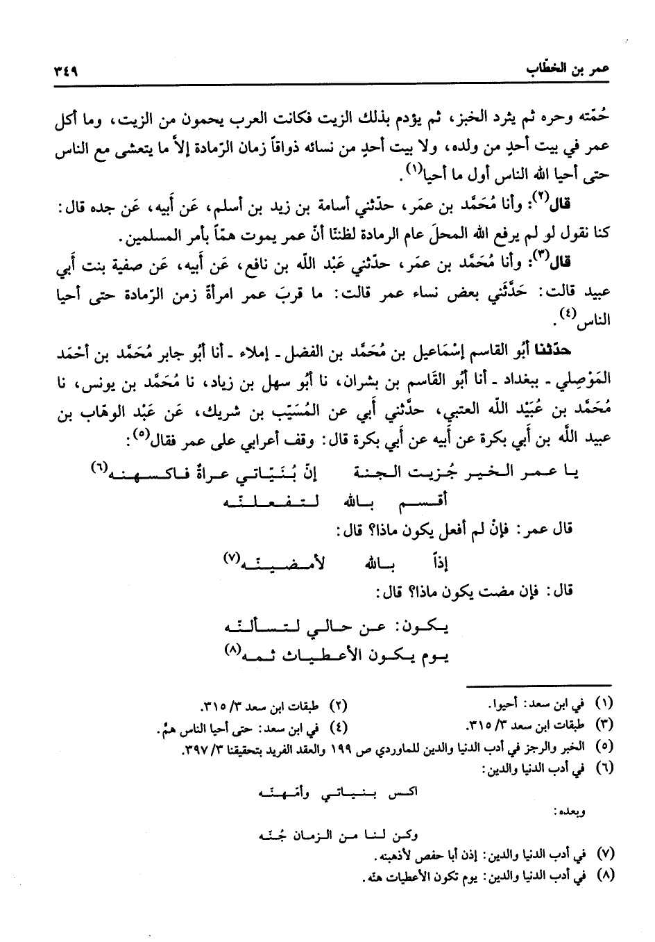 حمته وحره ثم يثرد الخبز ثم يؤدم بذلك الزيت فكانت العرب يحمون من الزيت وما أكل عمر في بيت أحد من ولده ولا بيت أحد من نسائه ذواقا زمان الرمادة إلا ما يتعشى مع الناس حتى أحيا الله الناس أول ما أحيا (1) قال (2) وأنا محمد بن عمر حدثني أسامة بن زيد بن أسلم عن أبيه عن جده قال كنا نقول لو لم يرفع الله المحل عام الرمادة لظننا أن عمر يموت هما بأمر المسلمين قال (3) وأنا محمد بن عمر حدثني عبد الله بن نافع عن أبيه عن صفية بنت أبي عبيد قالت حدثني بعض نساء عمر قالت ما قرب عمر امرأة زمن الرمادة حتى أحيا الناس (4) حدثنا أبو القاسم إسماعيل بن محمد بن الفضل إملاء أنا أبو جابر محمد بن أحمد الموصلي ببغداد أنا أبو القاسم بن بشران نا أبو سهل بن زياد نا محمد بن يونس نا محمد بن عبيد الله العتبي حدثني أبي عن المسيب بن شريك عن عبد الوهاب بن عبيد الله بن أبي بكرة عن أبيه عن أبي بكرة قال وقف أعرابي على عمر فقال (5) : يا عمر الخير جزيت الجنة * إن بنياتي عراة فاكسهنه (6) أقسم بالله لتفعلنه قال عمر فإن لم أفعل يكون ماذا قال إذا بالله لأمضينه (7) قال فإن مضت يكون ماذا قال يكون عن حالي لتسألنه يوم يكون الأعطيات ثمه (8)