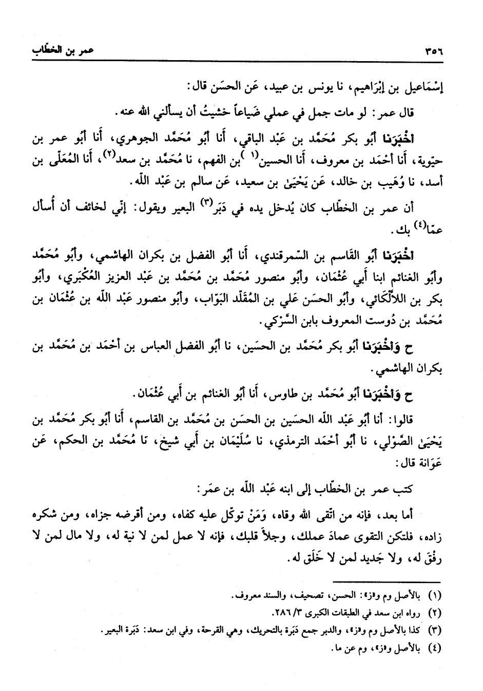إسماعيل بن إبراهيم نا يونس بن عبيد عن الحسن قال قال عمر لو مات جمل في عملي ضياعا خشيت أن يسألني الله عنه أخبرنا أبو بكر محمد بن عبد الباقي أنا أبو محمد الجوهري أنا أبو عمر بن حيوية أنا أحمد بن معروف أنا الحسين (1) بن الفهم نا محمد بن سعد (2) أنا المعلى بن أسد نا وهيب بن خالد عن يحيى بن سعيد عن سالم بن عبد الله أن عمر بن الخطاب كان يدخل يده في دبر (3) البعير ويقول إني لخائف أن أسأل عما (4) بك أخبرنا أبو القاسم بن السمرقندي أنا أبو الفضل بن بكران الهاشمي وأبو محمد وأبو الغنائم ابنا أبي عثمان وأبو منصور محمد بن محمد بن عبد العزيز العكبري وأبو بكر بن اللالكائي وأبو الحسن علي بن المقلد البواب وأبو منصور عبد الله بن عمثان بن محمد بن دوست المعروف بابن السركي ح وأخبرنا أبو بكر محمد بن الحسين نا أبو الفضل العباس بن أحمد بن محمد بن بكران الهاشمي ح وأخبرنا أبو محمد بن طاوس أنا أبو الغنائم بن أبي عثمان قالوا أنا أبو عبد الله الحسين بن الحسن بن محمد بن القاسم أنا أبو بكر محمد بن يحيى الصولي نا أبو أحمد الترمذي نا سليمان بن أبي شيخ نا محمد بن الحكم عن عوانة قال كتب عمر بن الخطاب إلى ابنه عبد الله بن عمر أما بعد فإنه من اتقى الله وقاه ومن توكل عليه كفاه ومن أقرضه جزاه ومن شكره زاده فلتكن التقوى عماد عملك وجلأ قلبك فإنه لا عمل لمن لا نية له ولا مال لمن لا رفق له ولا جديد لمن لا خلق له