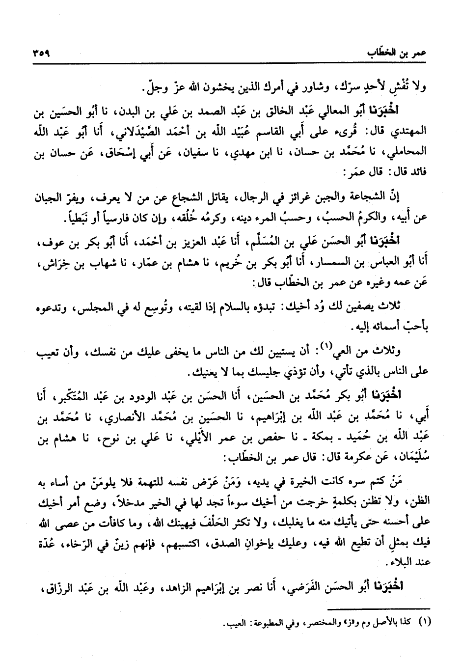 ولا تفش لأحد سرك وشاور في أمرك الذين يخشون الله عز وجل أخبرنا أبو المعالي عبد الخالق بن عبد الصمد بن علي بن البدن نا أبو الحسين بن المهتدي قال قرئ على أبي القاسم عبيد الله بن أحمد الصيدلاني أنا أبو عبد الله المحاملي نا محمد بن حسان نا ابن مهدي نا سفيان عن أبي إسحاق عن حسان بن فائد قال قال عمر إن الشجاعة والجبن غرائز في الرجال يقاتل الشجاع عن من لا يعرف ويفر الجبان عن أبيه والكرم الحسب وحسب المرء دينه وكرمه خلقه وإن كان فارسيا أو نبطيا أخبرنا أبو الحسن علي بن المسلم أنا عبد العزيز بن أحمد أنا أبو بكر بن عوف أنا أبو العباس بن السمسار أنا أبو بكر بن خريم نا هشام بن عمار نا شهاب بن خراش عن عمه وغيره عن عمر بن الخطاب قال ثلاث يصفين لك ود أخيك تبدؤه بالسلام إذا لقيته وتوسع له في المجلس وتدعوه بأحب أسمائه إليه وثلاث من العي (1) أن يستبين لك من الناس ما يخفى عليك من نفسك وأن تعيب على الناس بالذي تأتي وأن تؤذي جليسك بما لا يعنيك أخبرنا أبو بكر محمد بن الحسين أنا الحسن بن عبد الودود بن عبد المتكبر أنا أبي نا محمد بن عبد الله بن إبراهيم نا الحسين بن محمد الأنصاري نا محمد بن عبد الله بن حميد بمكة نا حفص بن عمر الأيلي نا علي بن نوح نا هشام بن سليمان عن عكرمة قال قال عمر بن الخطاب من كتم سره كانت الخيرة في يديه ومن عرض نفسه للتهمة فلا يلومن من أساء به الظن ولا تظنن بكلمة خرجت من أخيك سوءا تجد لها في الخير مدخلا وضع أمر أخيك على أحسنه حتى يأتيك منه ما يغلبك ولا تكثر الحلف فيهينك الله وما كافأت من عصى الله فيك بمثل أن تطيع الله فيه وعليك بإخوان الصدق اكتسبهم فإنهم زين في الرخاء عدة عند البلاء أخبرنا أبو الحسن الفرضي أنا نصر بن إبراهيم الزاهد وعبد الله بن عبد الرزاق