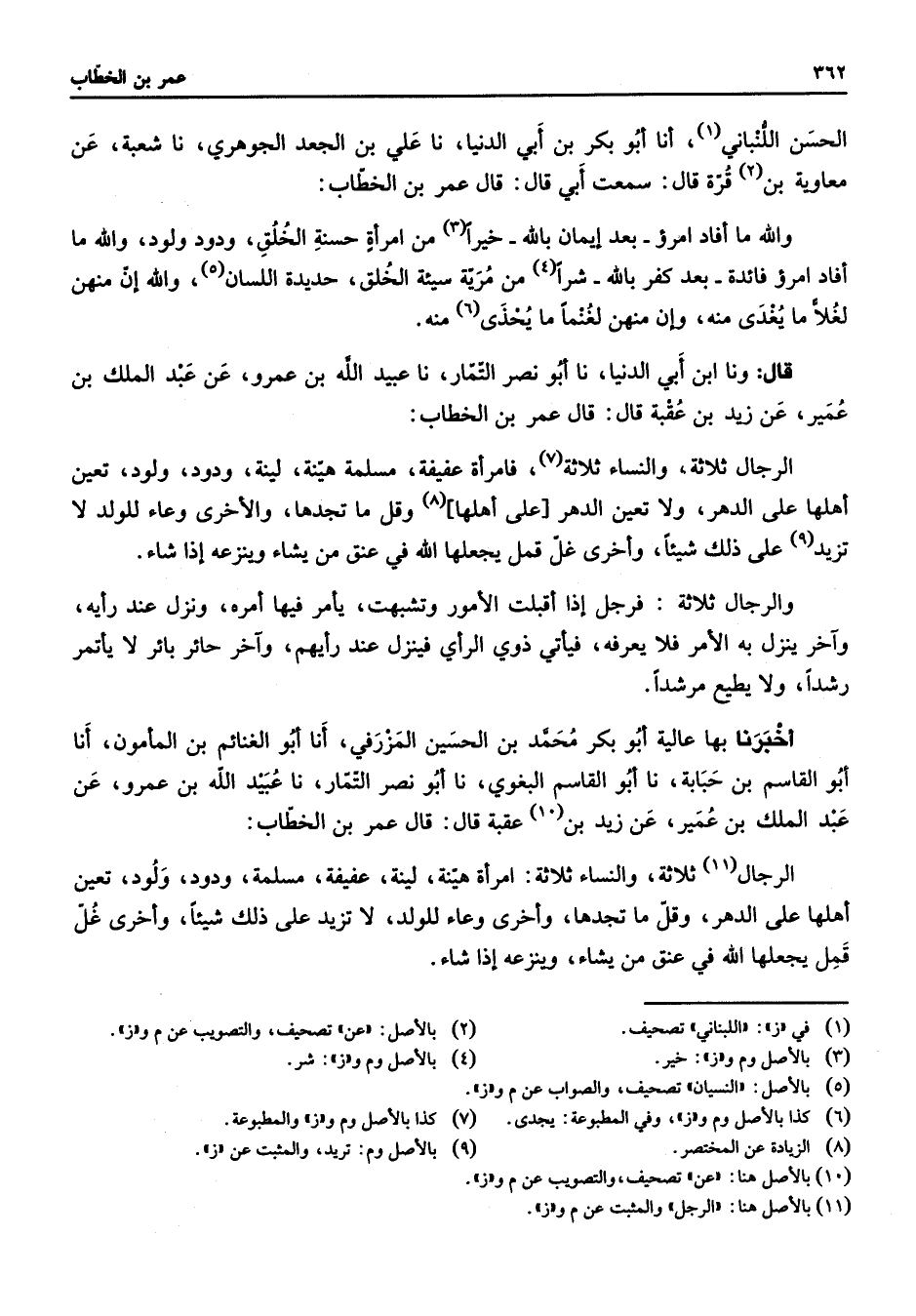 الحسن اللنباني (1) أنا أبو بكر بن أبي الدنيا نا علي بن الجعد الجوهري نا شعبة عن معاوية بن (2) قرة قال سمعت أبي قال قال عمر بن الخطاب والله ما أفاد امرؤ بعد إيمان بالله خيرا (3) من امرأة حسنة الخلق ودود ولود والله ما أفاد امرؤ فائدة بعد كفر بالله شرا (4) من مرية سيئة الخلق حديدة اللسان (5) والله إن منهن لغلا ما يغدى منه وإن منهن لغنما ما يحذى (6) منه قال ونا ابن أبي الدنيا نا أبو نصر التمار نا عبيد الله بن عمرو عن عبد الملك بن عمير عن زيد بن عقبة قال قال عمر بن الخطاب الرجال ثلاثة والنساء ثلاثة (7) فامرأة عفيفة مسلمة هينة لينة ودود ولود تعين أهلها على الدهر ولا تعين الدهر على أهلها (8) وقل ما تجدها والأخرى وعاء للولد لا تزيد (9) على ذلك شيئا وأخرى غل قمل يجعلها الله في عنق من يشاء وينزعه إذا شاء والرجال ثلاثة فرجل إذا أقبلت الأمور وتشبهت يأمر فيها أمره ونزل عند رأيه وآخر ينزل به الأمر فلا يعرفه فيأتي ذوي الرأي فينزل عند رأيهم وآخر حائر بائر لا يأتمر رشدا ولا يطيع مرشدا أخبرنا بها عالية أبو بكر محمد بن الحسين المزرفي أنا أبو الغنائم بن المأمون أنا أبو القاسم بن حبابة نا أبو القاسم البغوي نا أبو نصر التمار نا عبيد الله بن عمرو عن عبد الملك بن عمير عن زيد بن (10) عقبة قال قال عمر بن الخطاب الرجال (11) ثلاثة والنساء ثلاثة امرأة هينة لينة عفيفة مسلمة ودود ولود تعين أهلها على الدهر وقل ما تجدها وأخرى وعاء للولد لا تزيد على ذلك شيئا وأخرى غل قمل يجعلها الله في عنق من يشاء وينزعه إذا شاء