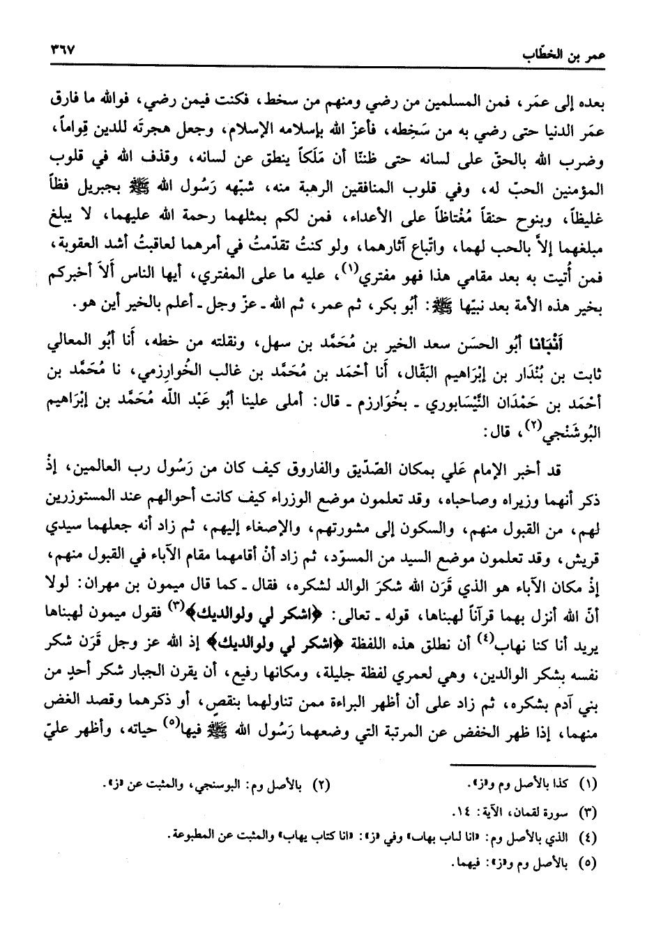 بعده إلى عمر فمن المسلمين من رضي ومنهم من سخط فكنت فيمن رضي فوالله ما فارق عمر الدنيا حتى رضي به من سخطه فأعز الله بإسلامه الإسلام وجعل هجرته للدين قواما وضرب الله بالحق على لسانه حتى ظننا أن ملكا ينطق عن لسانه وقذف الله في قلوب المؤمنين الحب له وفي قلوب المنافقين الرهبة منه شبهه رسول الله (صلى الله عليه وسلم) بجبريل فظا غليظا وبنوح حنقا مغتاظا على الأعداء فمن لكم بمثلهما رحمة الله عليهما لا يبلغ مبلغهما إلا بالحب لهما واتباع آثارهما ولو كنت تقدمت في أمرهما لعاقبت أشد العقوبة فمن أتيت به بعد مقامي هذا فهو مفتري (1) عليه ما على المفتري أيها الناس ألا أخبركم بخير هذه الأمة بعد نبيها (صلى الله عليه وسلم) أبو بكر ثم عمر ثم الله عز وجل أعلم بالخير أين هو أنبأنا أبو الحسن سعد الخير بن محمد بن سهل ونقلته من خطه أنا أبو المعالي ثابت بن بندار بن إبراهيم البقال أنا أحمد بن محمد بن غالب الخوارزمي نا محمد بن أحمد بن حمدان النيسابوري بخوارزم قال أملى علينا أبو عبد الله محمد بن إبراهيم البوشنجي (2) قال قد أخبر الإمام علي بمكان الصديق والفاروق كيف كان من رسول رب العالمين إذ ذكر أنهما وزيراه وصاحباه وقد تعلمون موضع الوزراء كيف كانت أحوالهم عند المستوزرين لهم من القبول منهم والسكون إلى مشورتهم والإصغاء إليهم ثم زاد أنه جعلهما سيدي قريش وقد تعلمون موضع السيد من المسود ثم زاد أن أقامهما مقام الآباء في القبول منهم إذ مكان الآباء هو الذي قرن الله شكر الوالد لشكره فقال كما قال ميمون بن مهران لولا أن الله أنزل بهما قرآنا لهبناها قوله تعالى " اشكر لي ولوالديك " (3) فقول ميمون لهبناها يريد أنا كنا نهاب (4) أن نطلق هذه اللفظة " اشكر لي ولوالديك " إذ الله عز وجل قرن شكر نفسه بشكر الوالدين وهي لعمري لفظة جليلة ومكانها رفيع أن يقرن الجبار شكر أحد من بني آدم بشكره ثم زاد على أن أظهر البراءة ممن تناولهما بنقص أو ذكرهما وقصد الغض منهما إذا ظهر الخفض عن المرتبة التي وضعهما رسول الله (صلى الله عليه وسلم) فيها (5) حياته وأظهر علي