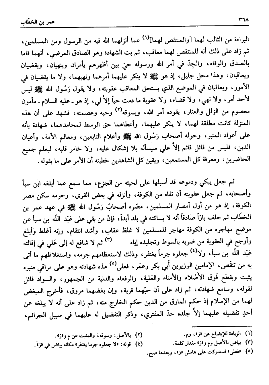 البراءة من الثالث لهما (1) والمنتقص لهما عما أنزلهما الله فيه من الرسول ومن المسلمين ثم زاد على ذلك أنه للمنتقص لهما معاقب ثم بت الشهادة وهو الصادق المرضي أنهما قاما بالصدق والوفاء والجد في أمر الله ورسوله حي بين أظهرهم يأمران وينهيان ويقضيان ويعاقبان وهذا محل جليل إذ هو (صلى الله عليه وسلم) لا ينكر عليهما أمرهما ونهيهما ولا ما يقضيان في الأمور ويعاقبان في الموضع الذي يستحق المعاقب عقوبته ولا يقول رسول الله (صلى الله عليه وسلم) ليس لأحد أمر ولا نهي ولا قضاء ولا عقوبة ما دمت حيا إلا لي إذ هو عليه السلام مأمون معصوم من الزلل والعثار يقوده أمر الله ويسوقه (2) وحيه وعصمته فشهد على أن هذه المنزلة كانت مطلقة لهما لا ينكر عليهما وأعطاهما حق الوسط لمحامدهما شهادة بأنه على أعواد المنبر وحوله أصحاب رسول الله (صلى الله عليه وسلم) وأعلام التابعين ومعالز الأمة وأعيان الدين فليس من قائل قائم إلا علي سيسأله بلا إشكال عليه ولا خامر قلبه ليعلم جميع الحاضرين ومعرفة كل المستمعين ويقين كل الشاهدين خطبته أن الأمر على ما يقوله ثم جعل يبكي ودموعه قد أسبلها على لحيته من الجزع مما سمع عما أبلغه ابن سبأ وأصحابه ثم جعل عقوبته أن نفاه من الكوفة وأنزله في بعض القرى وحرمه سكن مصر الكوفة إذ هو من أول أمصار المسلمين مصره أصحاب رسول الله (صلى الله عليه وسلم) في عهد عمر بن الخطاب ثم حلف بارا صادقا أنه لا يساكنه في بلد أبدا فإن من بقي على عبد الله بن سبأ عن موضع مهاجره من الكوفة مهاجر للمسلمين لا غلظ عقاب وأشد انتقام وإنه أغلظ وأبلغ وأوجع في العقوبة من ضربه بالسوط وتجليده إياه (3) ثم لا شافع له إلى علي في إقالته عبد الله بن سبأ ولا جعلوه جرما يغتفر وذلك لاستعظامهم جرمه واستغلاظهم ما أتى به من تنقص الإمامين الوزيرين أبي بكر وعمر فعلى (5) هذه شهادته وهو على مراقي منبره يثبت ويقطع فوق الأصلاء والأمناء والعلية والرفعاء والدنية من الجمهور والسواد قائل لقوله وسامع شهادته ثم زاد على أن حبهما قربة وإن بغضهما مروق فأخرج المبغض لهما من الإسلام إذ حكم المارق من الدين حكم الخارج منه ثم زاد على أنه لا يبلغه عن أحد تفضيله عليهما إلا جلده حد المفتري وذكر التفضيل له عليهما في سبيل الجرائم