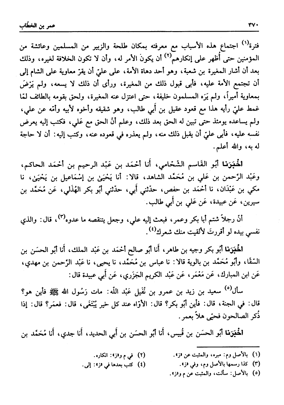 فترة (1) اجتماع هذه الأسباب مع معرفته بمكان طلحة والزبير من المسلمين وعائشة من المؤمنين حتى أظهر على إنكاره (2) أن يكون الأمر له وأن لا تكون الخلافة لغيره وذلك بعد أن أشار المغيرة بن شعبة وهو أحد دهاة الأمة على علي أن يقر معاوية على الشام إلى أن تجتمع الأمة عليه فأبى قبول ذلك من المغيرة ورأى أن ذلك لا يسعه ولم يرض بمعاوية أميرا ولم يره المسلمون خليفة حتى اعتزل عنه المغيرة ولحق بقومه بالطائف لما غمط علي رأيه هذا مع قعود عقيل بن أبي طالب وهو شقيقه وأخوه لأبيه وأمه عن علي ولم يساعده يومئذ حتى تبين له الحق بعد ذلك وعلم أن الحق مع علي فكتب إليه يعرض نفسه عليه فأبى علي أن يقبل ذلك منه ولم يعذره في قعوده عنه وكتب إليه أن لا حاجة له به والله أعلم أخبرنا أبو القاسم الشحامي أنا أحمد بن عبد الرحيم بن أحمد الحاكم وعبد الرحمن بن علي بن محمد الشاهد قالا أنا يحيى بن إسماعيل بن يحيى نا مكي بن عبدان نا أحمد بن حفص حدثني أبي حدثني أبو بكر الهذلي عن محمد بن سيرين عن عبيدة عن علي بن أبي طالب أن رجلا شتم أبا بكر وعمر فبعث إليه علي وجعل يتنقصه ما عدوه (3) قال والذي نفسي بيده لو أقررت لألقيت منك شعرك (4) أخبرنا أبو بكر وجيه بن طاهر أنا أبو صالح أحمد بن عبد الملك أنا أبو الحسن بن السقا وأبو محمد بن بالوية قالا نا عباس بن محمد نا يحيى نا عبد الرحمن بن مهدي عن ابن المبارك عن معمر عن عبد الكريم الجزري عن أبي عبيدة قال سأل (5) سعيد بن زيد بن عمرو بن نفيل عبد الله مات رسول الله (صلى الله عليه وسلم) فأين هو قال في الجنة قال فأين أبو بكر قال الأواه عند كل خير يبتغى قال فعمر قال إذا ذكر الصالحون فحيى هلا بعمر أخبرنا أبو الحسن بن قبيس أنا أبو الحسن بن أبي الحديد أنا جدي أنا محمد بن