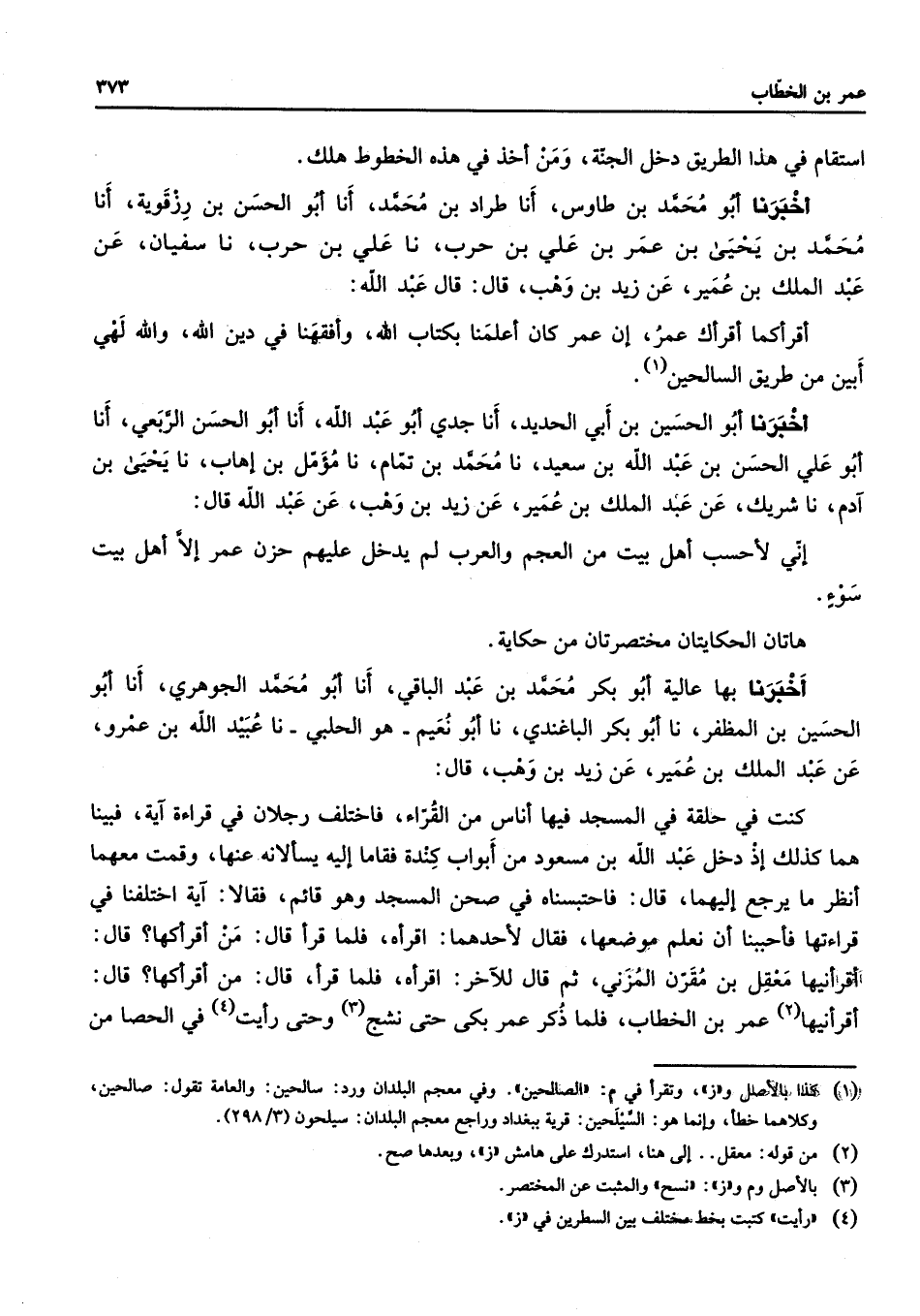 استقام في هذا الطريق دخل الجنة ومن أخذ في هذه الخطوط هلك أخبرنا أبو محمد بن طاوس أنا طراد بن محمد أنا أبو الحسن بن رزقوية أنا محمد بن بحيى بن عمر بن علي بن حرب نا علي بن حرب نا سفيان عن عبد الملك بن عمير عن زيد بن وهب قال قال عبد الله أقرأكما أقرأك عمر إن عمر كان أعلمنا بكتاب الله وأفقهنا في دين الله والله لهي أبين من طريق السالحين (1) أخبرنا أبو الحسين بن أبي الحديد أنا جدي أبو عبد الله أنا أبو الحسن الربعي أنا أبو علي الحسن بن عبد الله بن سعيد نا محمد بن تمام نا مؤمل بن إهاب نا يحيى بن آدم نا شريك عن عبد الملك بن عمير عن زيد بن وهب عن عبد الله قال إني لأحسب أهل بيت من العجم والعرب لم يدخل عليهم حزن عمر إلا أهل بيت سوء هاتان الحكايتان مختصرتان من حكاية أخبرنا بها عالية أبو بكر محمد بن عبد الباقي أنا أبو محمد الجوهري أنا أبو الحسين بن المظفر نا أبو بكر الباغندي نا أبو نعيم هو الحلبي نا عبيد الله بن عمرو عن عبد الملك بن عمير عن زيد بن وهب قال كنت في حلقة في المسجد فيها أناس من القراء فاختلف رجلان في قراءة آية فبينا هما كذلك إذ دخل عبد الله بن مسعود من أبواب كندة فقاما إليه يسألانه عنها وقمت معهما أنظر ما يرجع إليهما قال فاحتسبناه في صحن المسجد وهو قائم فقالا آية اختلفنا في قراءتها فأحببنا أن نعلم موضعها فقال لأحدهما اقرأه فلما قرأ قال من أقرأكها قال أقرأنيها معقل بن مقرن المزني ثم قال للآخر اقرأه فلما قرأ قال من أقرأكها قال أقرأنيها (2) عمر بن الخطاب فلما ذكر عمر بكى حتى نشج (3) وحتى رأيت (4) في الحصا من