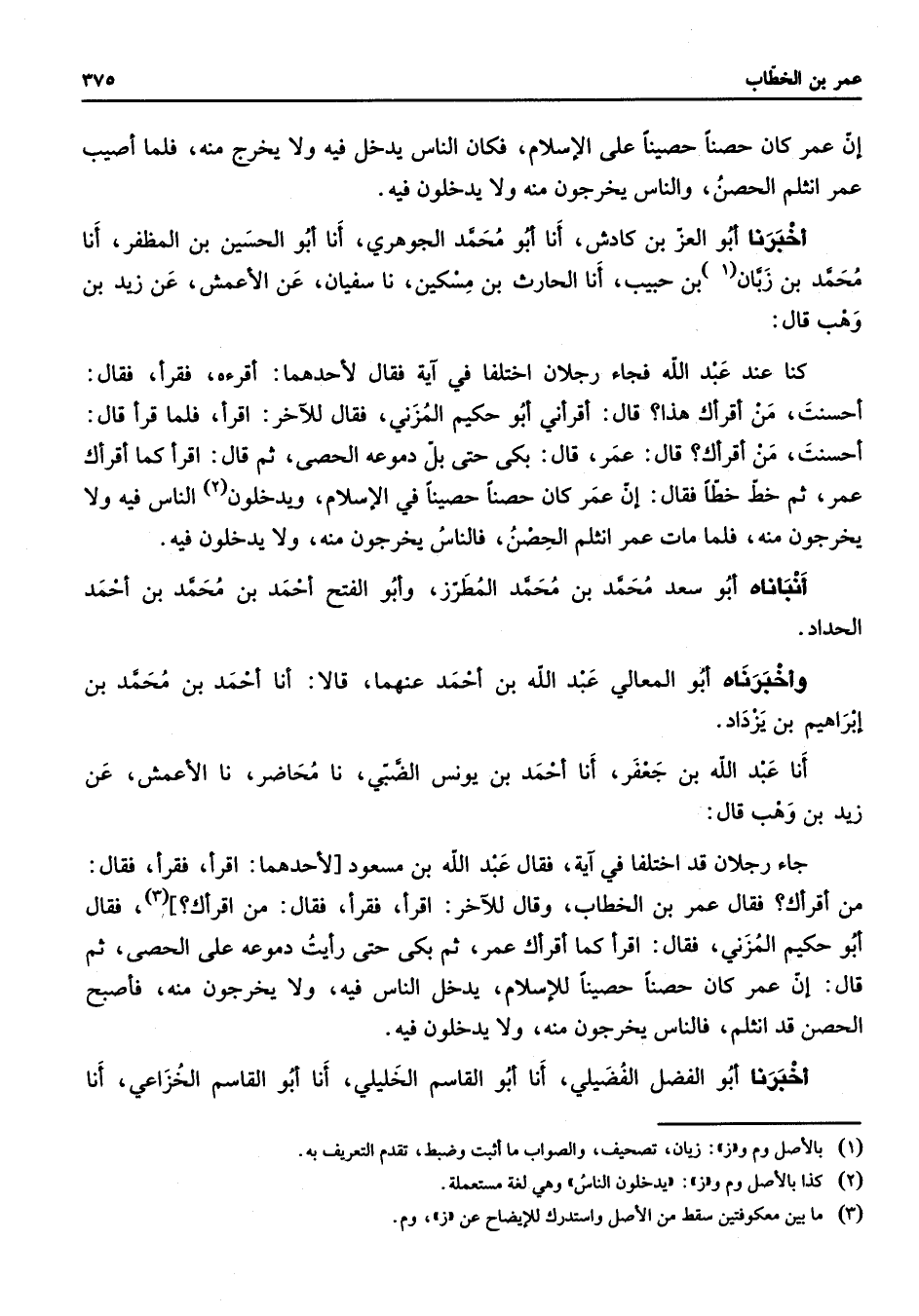 إن عمر كان حصنا حصينا على الإسلام فكان الناس يدخل فيه ولا يخرج منه فلما أصيب عمر انثلم الحصن والناس يخرجون منه ولا يدخلون فيه أخبرنا أبو العز بن كادش أنا أبو محمد الجوهري أنا أبو الحسين بن المظفر أنا محمد بن زبان (1) بن حبيب أنا الحارث بن مسكين نا سفيان عن الأعمش عن زيد بن وهب قال كنا عند عبد الله فجاء رجلان اختلفا في آية فقال لأحدهما أقرءه فقرأ فقال أحسنت من أقرأك هذا قال أقرأني أبو حكيم المزني فقال للآخر اقرأ فلما قرأ قال أحسنت من أقرأك قال عمر قال بكى حتى بل دموعه الحصى ثم قال اقرأكما أقرأك عمر ثم خط خطا فقال إن عمر كان حصنا حصينا في الإسلام ويدخلون (2) الناس فيه ولا يخرجون منه فلما مات عمر انثلم الحصن فالناس يخرجون منه ولا يدخلون فيه أنبأناه أبو سعد محمد بن محمد المطرز وأبو الفتح أحمد بن محمد بن أحمد الحداد وأخبرناه أبو المعالي عبد الله بن أحمد عنهما قالا أنا أحمد بن محمد بن إبراهيم بن يزداد أنا عبد الله بن جعفر أنا أحمد بن يونس الضبي نا محاضر نا الأعمش عن زيد بن وهب قال جاء رجلان قد اختلفا في آية فقال عبد الله بن مسعود لأحدهما اقرأ فقرأ فقال من أقرأك فقال عمر بن الخطاب وقال للآخر اقرأ فقرأ فقال من اقرأك (3) فقال أبو حكيم المزني فقال اقرأكما أقرأك عمر ثم بكى حتى رأيت دموعه على الحصى ثم قال إن عمر كان حصنا حصينا للإسلام يدخل الناس فيه ولا يخرجون منه فأصبح الحصن قد انثلم فالناس يخرجون منه ولا يدخلون فيه أخبرنا أبو الفضل الفضيلي أنا أبو القاسم الخليلي أنا أبو القاسم الخزاعي أنا
