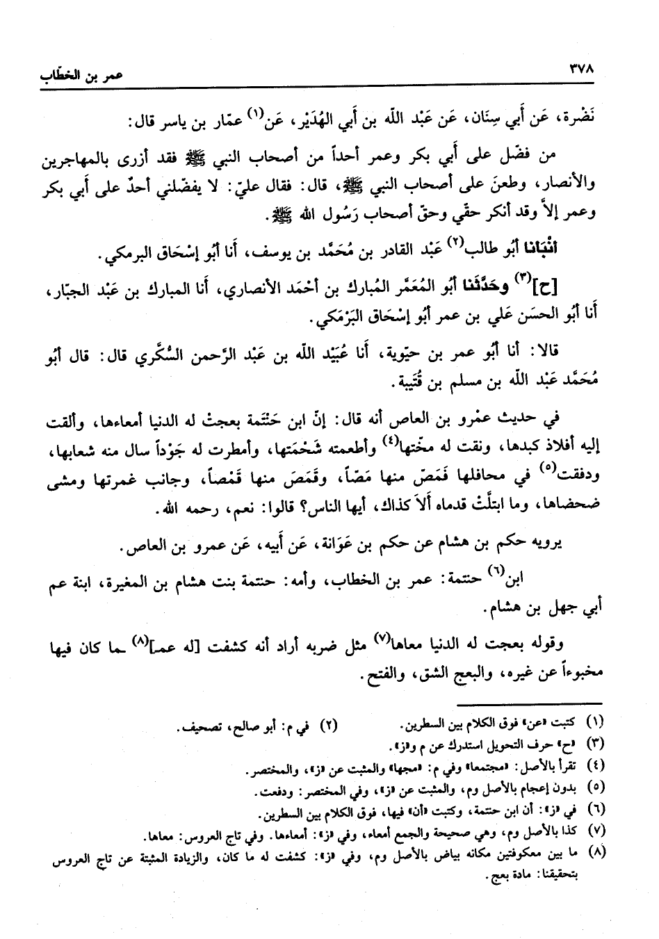 نضرة عن أبي سنان عن عبد الله بن أبي الهدير عن (1) عمار بن ياسر قال من فضل على أبي بكر وعمر أحدا من أصحاب النبي (صلى الله عليه وسلم) فقد أزرى بالمهاجرين والأنصار وطعن على أصحاب النبي (صلى الله عليه وسلم) قال فقال علي لا يفضلني أحد على أبي بكر وعمر إلا وقد أنكر حقي وحق أصحاب رسول الله (صلى الله عليه وسلم) أنبأنا أبو طالب (2) عبد القادر بن محمد بن يوسف أنا أبو إسحاق البرمكي ح (3) وحدثنا أبو المعمر المبارك بن أحمد الأنصاري أنا المبارك بن عبد الجبار أنا أبو الحسن علي بن عمر أبو إسحاق البرمكي قالا أنا أبو عمر بن حيوية أنا عبيد الله بن عبد الرحمن السكري قال قال أبو محمد عبد الله بن مسلم بن قتيبة في حديث عمرو بن العاص أنه قال إن ابن حنتمة بعجت له الدنيا أمعاءها وألقت إليه أفلاذ كبدها ونقت له مختها (4) وأطعمته شحمتها وأمطرت له جودا سال منه شعابها ودفقت (5) في محافلها فمص منها مصا وقمص منها قمصا وجانب غمرتها ومشى ضحضاها وما ابتلت قدماه ألا كذاك أيها الناس قالوا نعم رحمه الله يرويه حكم بن هشام عن حكم بن عوانة عن أبيه عن عمرو بن العاص ابن (6) حنتمة عمر بن الخطاب وأمه حنتمة بنت هشام بن المغيرة ابنة عم أبي جهل بن هشام وقوله بعجت له الدنيا معاها (7) مثل ضربه أراد أنه كشفت له عم (8) ما كان فيها مخبوءا عن غيره والبعج الشق والفتح