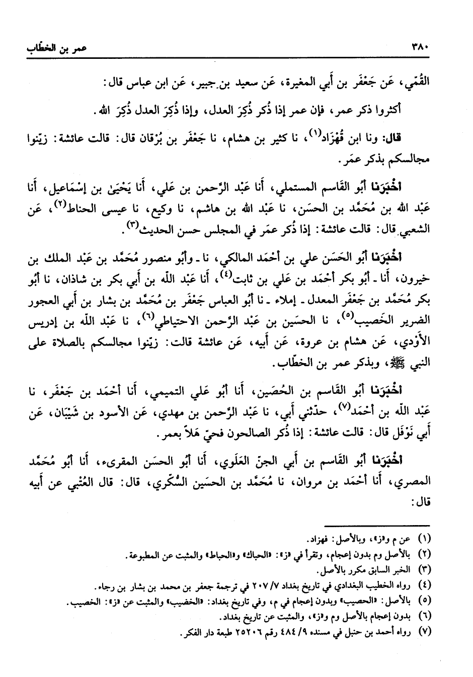 القمي عن جعفر بن أبي المغيرة عن سعيد بن جبير عن ابن عباس قال أكثروا ذكر عمر فإن عمر إذا ذكر ذكر العدل وإذا ذكر العدل ذكر الله قال ونا ابن قهزاد (1) نا كثير بن هشام نا جعفر بن برقان قال قالت عائشة زينوا مجالسكم بذكر عمر أخبرنا أبو القاسم المستملي أنا عبد الرحمن بن علي أنا يحيى بن إسماعيل أنا عبد الله بن محمد بن الحسن نا عبد الله بن هاشم نا وكيع نا عيسى الحناط (2) عن الشعبي قال قالت عائشة إذا ذكر عمر في المجلس حسن الحديث (3) أخبرنا أبو الحسن علي بن أحمد المالكي نا وأبو منصور محمد بن عبد الملك بن خيرون أنا أبو بكر أحمد بن علي بن ثابت (4) أنا عبد الله بن أبي بكر بن شاذان نا أبو بكر محمد بن جعفر المعدل إملاء نا أبو العباس جعفر بن محمد بن بشار بن أبي العجور الضرير الخصيب (5) نا الحسين بن عبد الرحمن الإحتياطي (6) نا عبد الله بن إدريس الأودي عن هشام بن عروة عن أبيه عن عائشة قالت زينوا مجالسكم بالصلاة على النبي (صلى الله عليه وسلم) وبذكر عمر بن الخطاب أخبرنا أبو القاسم بن الحصين أنا أبو علي التميمي أنا أحمد بن جعفر نا عبد الله بن أحمد (7) حدثني أبي نا عبد الرحمن بن مهدي عن الأسود بن شيبان عن أبي نوفل قال قالت عائشة إذا ذكر الصالحون فحي هلا بعمر أخبرنا أبو القاسم بن أبي الجن العلوي أنا أبو الحسن المقرئ أنا أبو محمد المصري أنا أحمد بن مروان نا محمد بن الحسين السكري قال قال العتبي عن أبيه قال