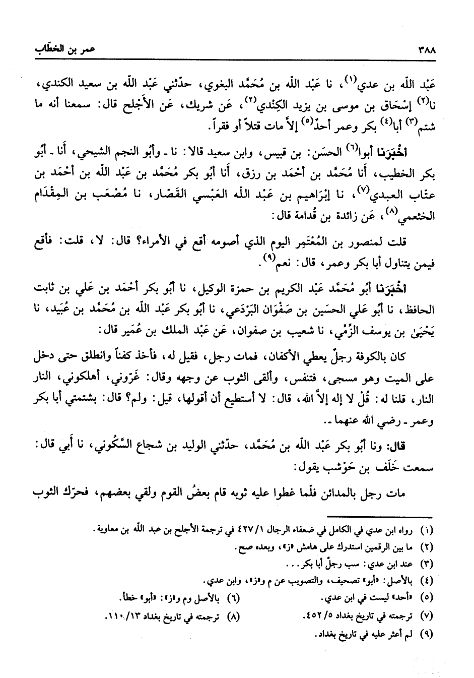 عبد الله بن عدي (1) نا عبد الله بن محمد البغوي حدثني عبد الله بن سعيد الكندي نا (2) إسحاق بن موسى بن يزيد الكندي (2) عن شريك عن الأجلح قال سمعنا أنه ما شتم (3) أبا (4) بكر وعمر أحد (5) إلا مات قتلا أو فقرا أخبرنا أبوا (6) الحسن بن قبيس وابن سعيد قالا نا وأبو النجم الشيحي أنا أبو بكر الخطيب أنا محمد بن أحمد بن رزق أنا أبو بكر محمد بن عبد الله بن أحمد بن عتاب العبدي (7) نا إبراهيم بن عبد الله العبسي القصار نا مصعب بن المقدام الخثعمي (8) عن زائدة بن قدامة قال قلت لمنصور بن المعتمر اليوم الذي أصومه أقع في الأمراء قال لا قلت فأقع فيمن يتناول أبا بكر وعمر قال نعم (9) أخبرنا أبو محمد عبد الكريم بن حمزة الوكيل نا أبو بكر أحمد بن علي بن ثابت الحافظ نا أبو علي الحسين بن صفوان البردعي نا أبو بكر عبد الله بن محمد بن عبيد نا يحيى بن يوسف الزمي نا شعيب بن صفوان عن عبد الملك بن عمير قال كان بالكوفة رجل يعطي الأكفان فمات رجل فقيل له فأخذ كفنا وانطلق حتى دخل على الميت وهو مسجى فتنفس وألقى الثوب عن وجهه وقال غروني أهلكوني النار النار قلنا له قل لا إله إلا الله قال لا أستطيع أن أقولها قيل ولم قال بشتمتي أبا بكر وعمر Bهما قال ونا أبو بكر عبد الله بن محمد حدثني الوليد بن شجاع السكوني نا أبي قال سمعت خلف بن حوشب يقول مات رجل بالمدائن فلما غطوا عليه ثوبه قام بعض القوم ولقي بعضهم فحرك الثوب