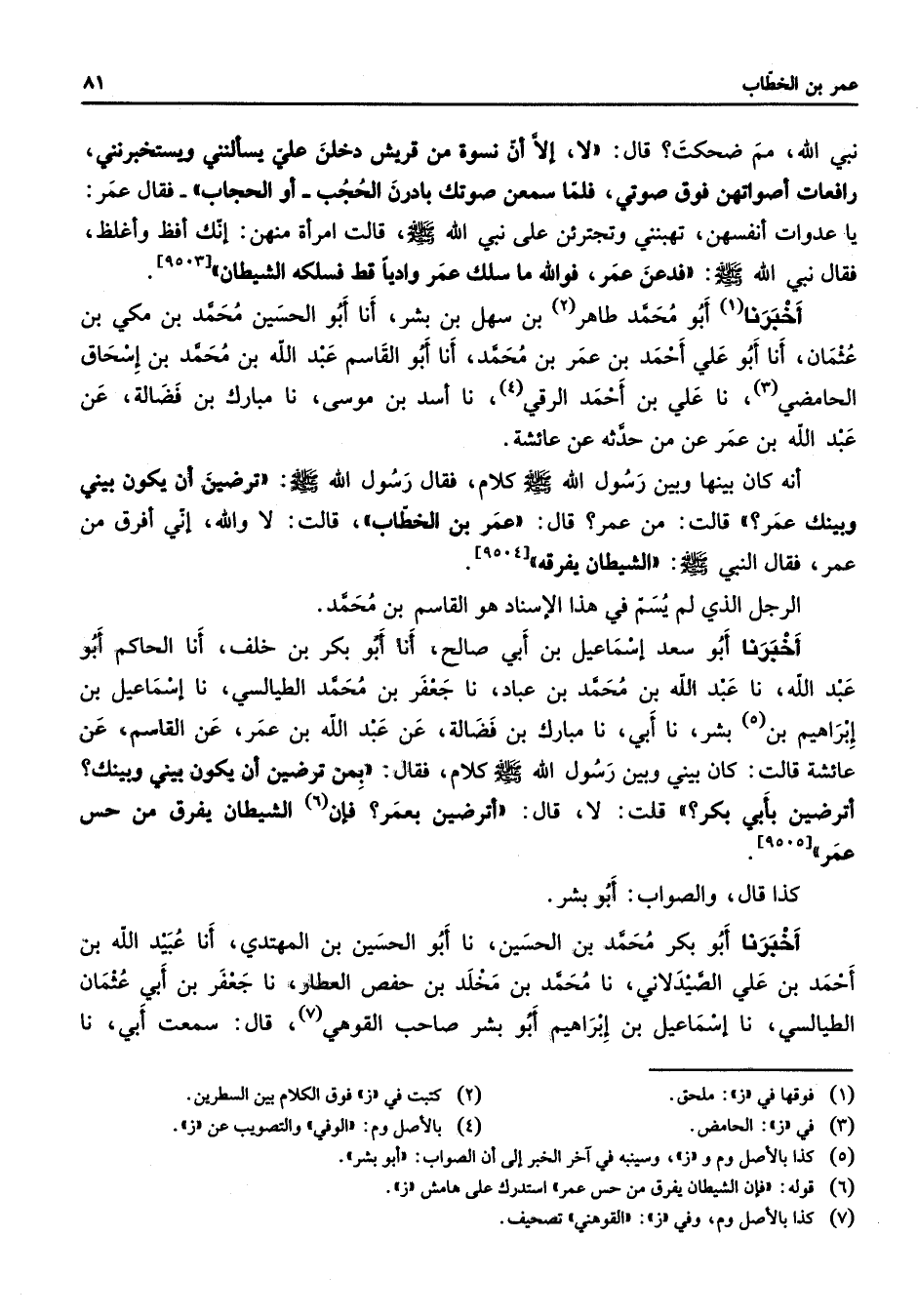 [9503] أخبرنا (1) أبو محمد طاهر (2) بن سهل بن بشر أنا أبو الحسين محمد بن مكي بن عثمان أنا أبو علي أحمد بن عمر بن محمد أنا أبو القاسم عبد الله بن محمد بن إسحاق الحامضي (3) نا علي بن أحمد الرقي (4) نا أسد بن موسى نا مبارك بن فضالة عن عبد الله بن عمر عن من حدثه عن عائشة أنه كان بينها وبين رسول الله (صلى الله عليه وسلم) كلام فقال رسول الله (صلى الله عليه وسلم) ترضين أن يكون بيني وبينك عمر قالت من عمر قال عمر بن الخطاب قالت لا والله إني أفرق من عمر فقال النبي (صلى الله عليه وسلم) الشيطان يفرقه