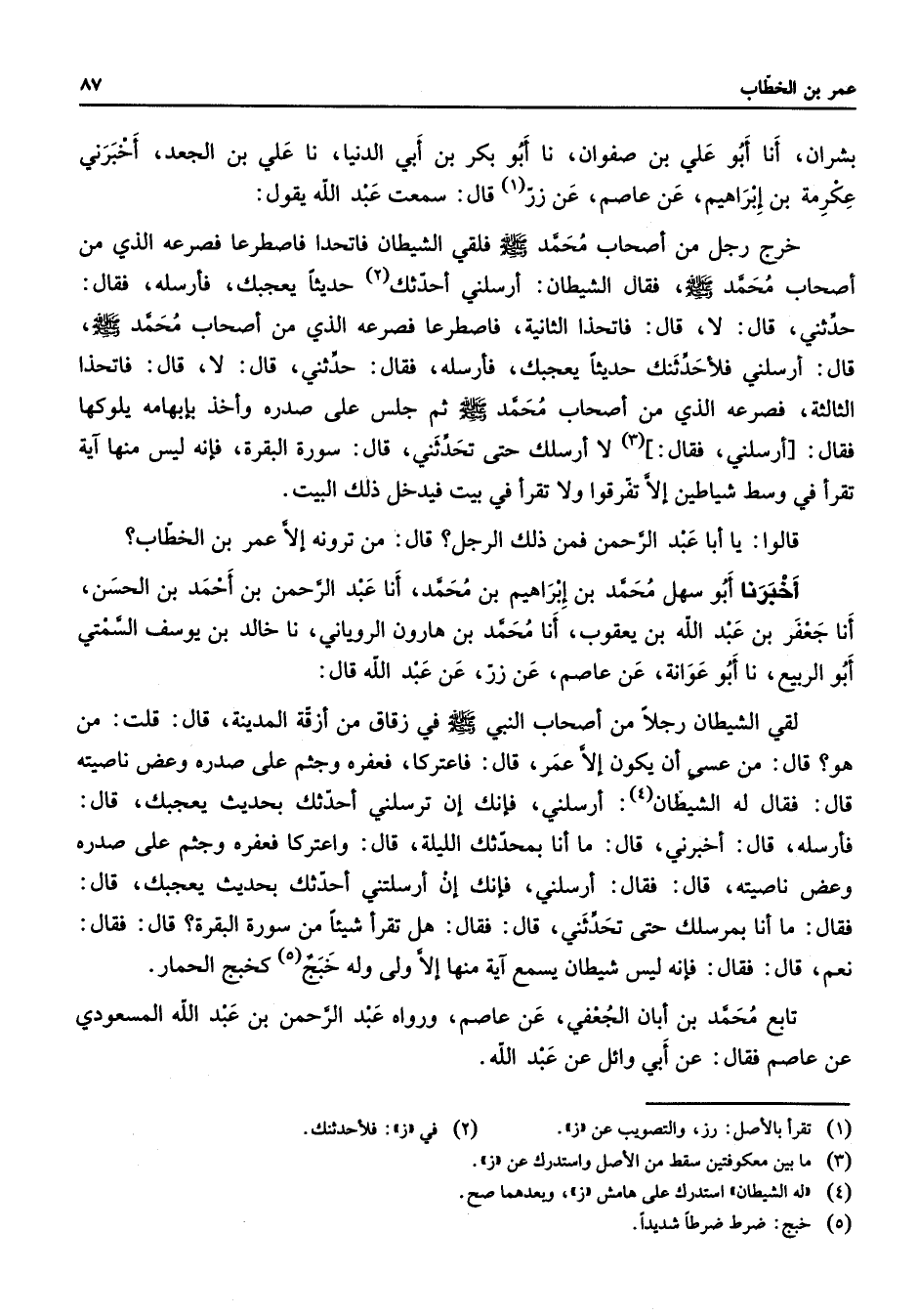 بشران أنا أبو علي بن صفوان نا أبو بكر بن أبي الدنيا نا علي بن الجعد أخبرني عكرمة بن إبراهيم عن عاصم عن زر (1) قال سمعت عبد الله يقول خرج رجل من أصحاب محمد (صلى الله عليه وسلم) فلقي الشيطان فاتحدا فاصطرعا فصرعه الذي من أصحاب محمد (صلى الله عليه وسلم) فقال الشيطان أرسلني أحدثك (2) حديثا يعجبك فأرسله فقال حدثني قال لا قال فاتحذا الثانية فاصطرعا فصرعه الذي من أصحاب محمد (صلى الله عليه وسلم) قال أرسلني فلأحدثنك حديثا يعجبك فأرسله فقال حدثني قال لا قال فاتحذا الثالثة فصرعه الذي من أصحاب محمد (صلى الله عليه وسلم) ثم جلس على صدره وأخذ بإبهامه يلوكها فقال أرسلني فقال (3) لا أرسلك حتى تحدثني قال سورة البقرة فإنه ليس منها آية تقرأ في وسط شياطين إلا تفرقوا ولا تقرأ في بيت فيدخل ذلك البيت قالوا يا أبا عبد الرحمن فمن ذلك الرجل قال من ترونه إلا عمر بن الخطاب أخبرنا أبو سهل محمد بن إبراهيم بن محمد أنا عبد الرحمن بن أحمد بن الحسن أنا جعفر بن عبد الله بن يعقوب أنا محمد بن هارون الروياني نا خالد بن يوسف السمتي أبو الربيع نا أبو عوانة عن عاصم عن زر عن عبد الله قال لقي الشيطان رجلا من أصحاب النبي (صلى الله عليه وسلم) في زقاق من أزقة المدينة قال قلت من هو قال من عسى أن يكون إلا عمر قال فاعتركا فعفره وجثم على صدره وعض ناصيته قال فقال له الشيطان (4) أرسلني فإنك إن ترسلني أحدثك بحديث يعجبك قال فأرسله قال أخبرني قال ما أنا بمحدثك الليلة قال واعتركا فعفره وجثم على صدره وعض ناصيته قال فقال أرسلني فإنك إن أرسلتني أحدثك بحديث يعجبك قال فقال ما أنا بمرسلك حتى تحدثني قال فقال هل تقرأ شيئا من سورة البقرة قال فقال نعم قال فقال فإنه ليس شيطان يسمع آية منها إلا ولى وله خبج (5) كخبج الحمار تابع محمد بن أبان الجعفي عن عاصم ورواه عبد الرحمن بن عبد الله المسعودي عن عاصم فقال عن أبي وائل عن عبد الله