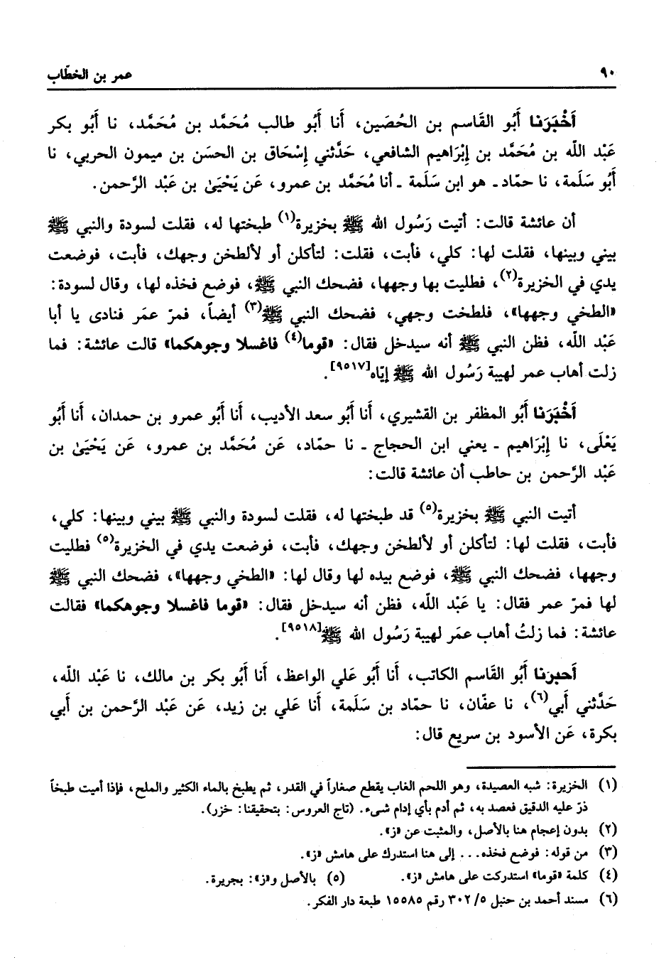 أخبرنا أبو القاسم بن الحصين أنا أبو طالب محمد بن محمد نا أبو بكر عبد الله بن محمد بن إبراهيم الشافعي حدثني إسحاق بن الحسن بن ميمون الحربي نا أبو سلمة نا حماد هو ابن سلمة أنا محمد بن عمرو عن يحيى بن عبد الرحمن أن عائشة قالت أتيت رسول الله (صلى الله عليه وسلم) بخزيرة (1) طبختها له فقلت لسودة والنبي (صلى الله عليه وسلم) بيني وبينها فقلت لها كلي فأبت فقلت لتأكلن أو لألطخن وجهك فأبت فوضعت يدي في الخزيرة (2) فطليت بها وجهها فضحك النبي (صلى الله عليه وسلم) فوضع فخذه لها وقال لسودة الطخي وجهها فلطخت وجهي فضحك النبي (صلى الله عليه وسلم) (3) أيضا فمر عمر فنادى يا أبا عبد الله فظن النبي (صلى الله عليه وسلم) أنه سيدخل فقال قوما (4) فاغسلا وجوهكما قالت عائشة فما زلت أهاب عمر لهيبة رسول الله (صلى الله عليه وسلم) إياه