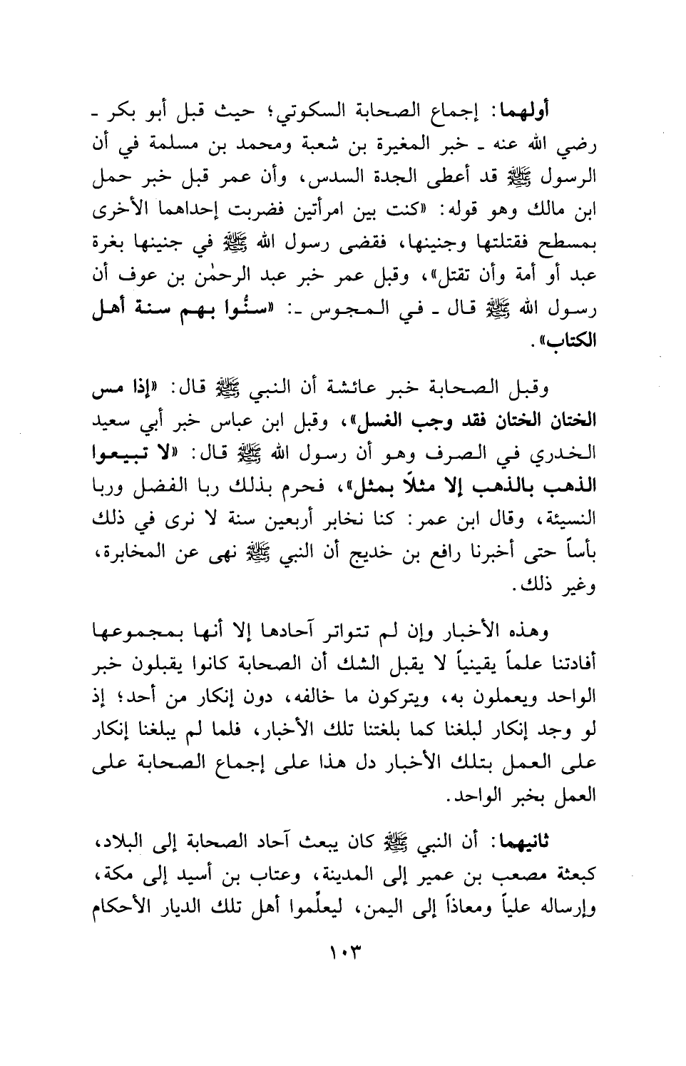 وقبل الصحابة خبر عائشة أن النبي - صلى الله عليه وسلم - قال: " إذا مس الختان الختان فقد وجب الغسل "، وقبل ابن عباس خبر أبي سعيد الخدري في الصرف وهو أن رسول الله - صلى الله عليه وسلم - قال: " لا تبيعوا الذهب بالذهب إلا مثلاً بمثل"، فحرم بذلك ربا الفضل وربا النسيئة، وقال ابن عمر: كنا نخابر أربعين سنة لا نرى في ذلك بأساً حتى أخبرنا رافع بن خديج أن النبي - صلى الله عليه وسلم - نهى عن المخابرة، وغير ذلك.