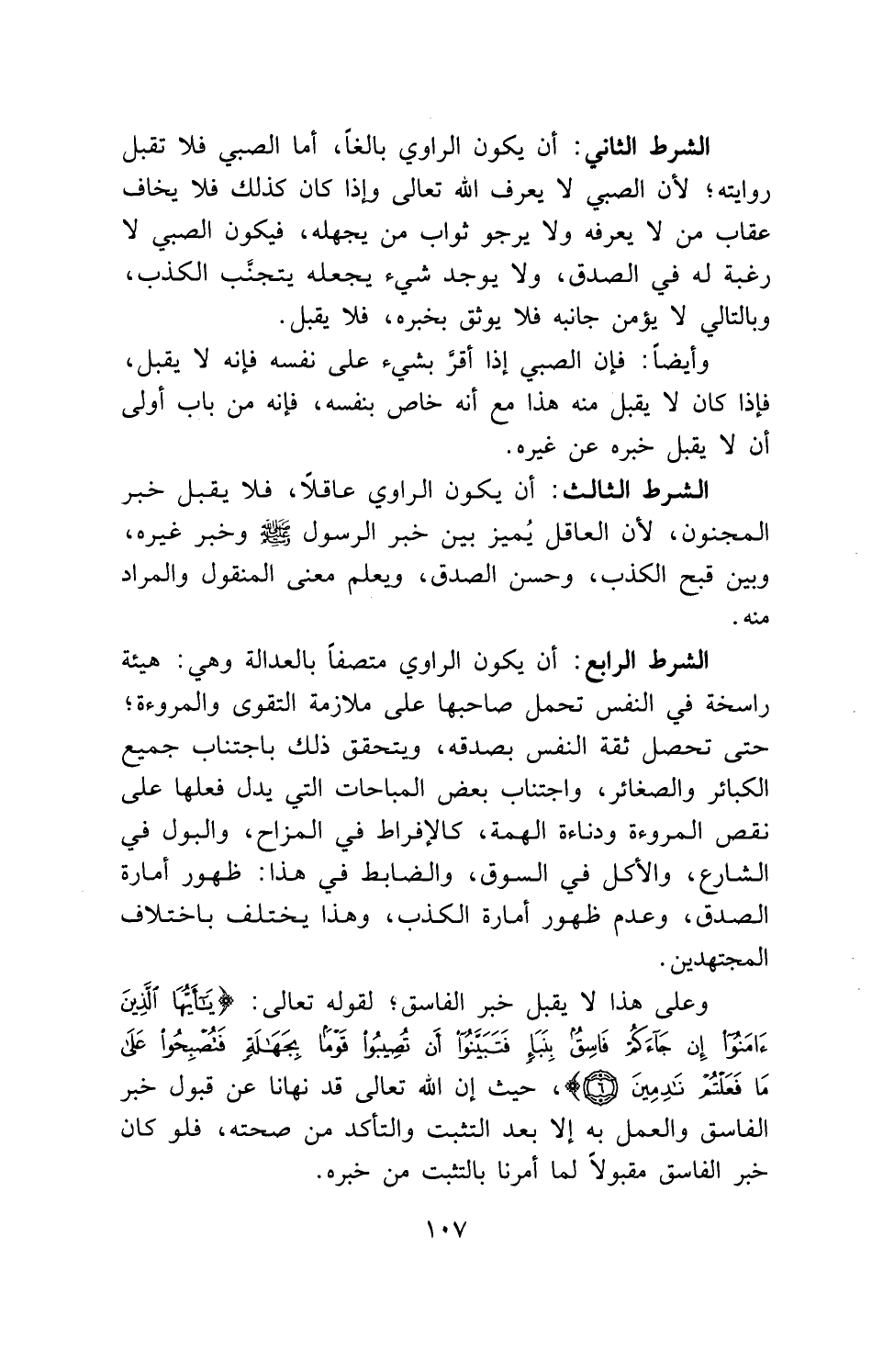 الشرط الثاني: أن يكون الراوي بالغاً، أما الصبي فلا تقبل روايته؛ لأن الصبي لا يعرف الله تعالى وإذا كان كذلك فلا يخاف عقاب من لا يعرفه ولا يرجو ثواب من يجهله، فيكون الصبي لا رغبة له في الصدق، ولا يوجد شيء يجعله يتجنب الكذب، وبالتالي لا يؤمن جانبه فلا يوثق بخبره، فلا يقبل.