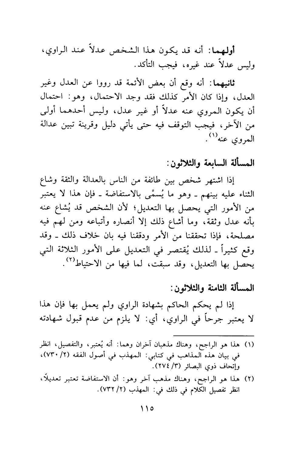 ثانيهما: أنه وقع أن بعض الأئمة قد رووا عن العدل وغير العدل، وإذا كان الأمر كذلك فقد وجد الاحتمال، وهو: احتمال أن يكون المروي عنه عدلاً أو غير عدل، وليس أحدهما أولى من الآخر، فيجب التوقف فيه حتى يأتي دليل وقرينة تبين عدالة المروي عنه.