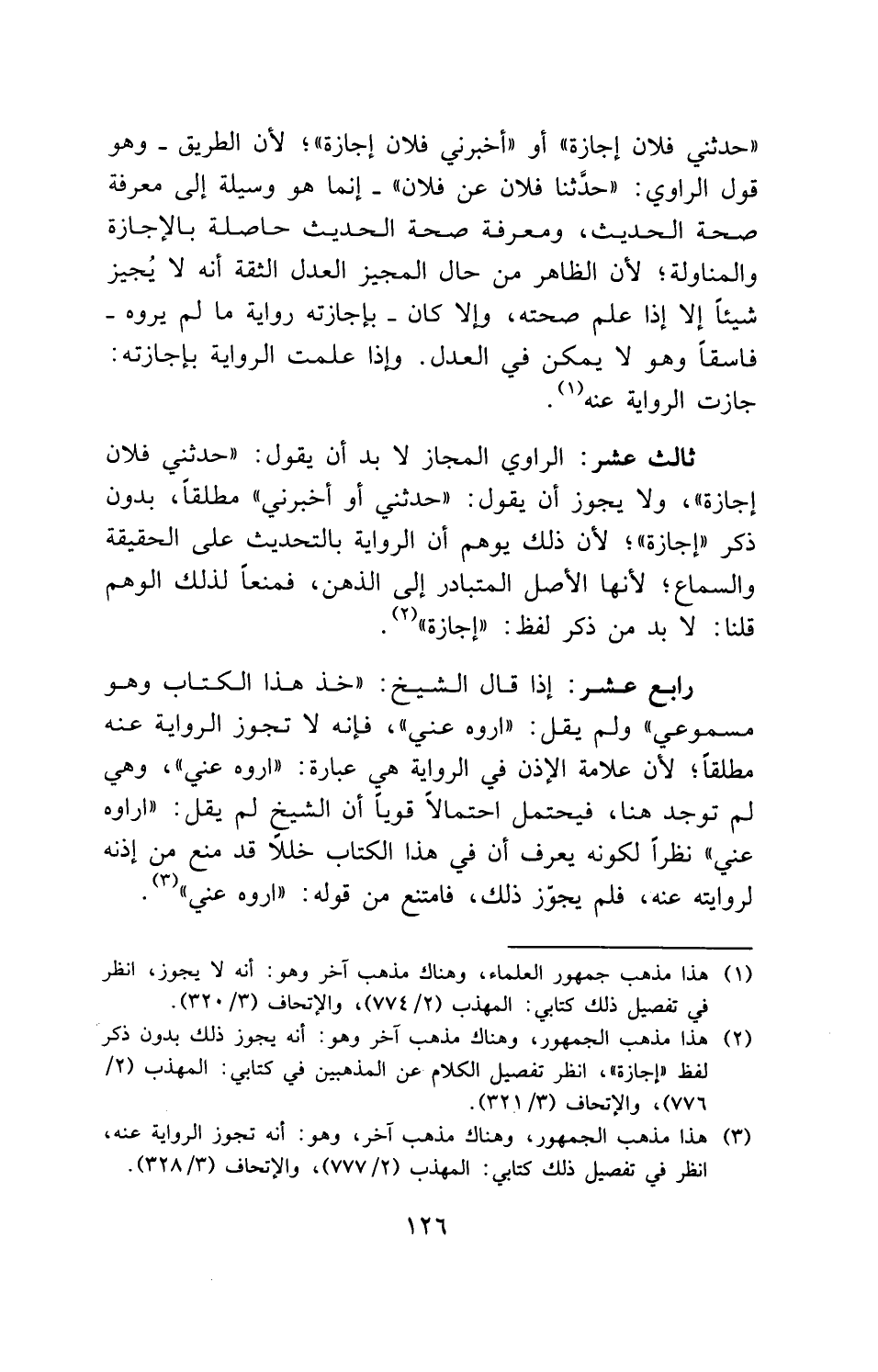 رابع عشر: إذا قال الشيخ: " خذ هذا الكتاب وهو مسموعي " ولم يقل: " اروه عني "، فإنه لا تجوز الرواية عنه مطلقاً؛ لأن علامة الإذن في الرواية هي عبارة: " اروه عني "، وهي لم توجد هنا، فيحتمل احتمالاً قوياً أن الشيخ لم يقل: " اراوه عني " نظراً لكونه يعرف أن في هذا الكتاب خللاً قد منع من إذنه لروايته عنه، فلم يجوز ذلك، فامتنع من قوله: " اروه عني ".