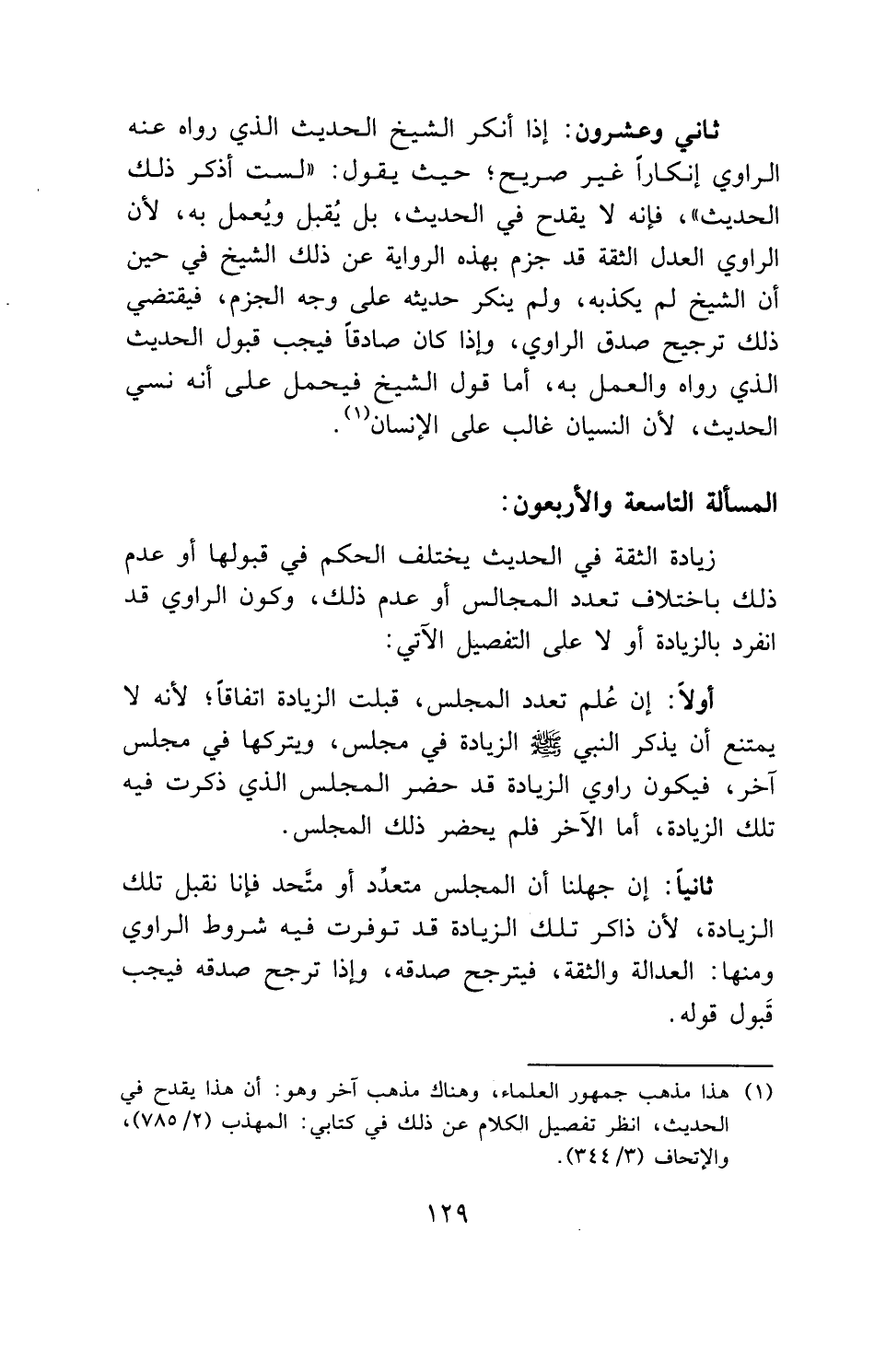 ثاني وعشرون: إذا أنكر الشيخ الحديث الذي رواه عنه الراوي إنكاراً غير صريح؛ حيث يقول: " لست أذكر ذلك الحديث "، فإنه لا يقدح في الحديث، بل يُقبل ويُعمل به، لأن الراوي العدل الثقة قد جزم بهذه الرواية عن ذلك الشيخ في حين أن الشيخ لم يكذبه، ولم ينكر حديثه على وجه الجزم، فيقتضي ذلك ترجيح صدق الراوي، واذا كان صادقاً فيجب قبول الحديث الذي رواه والعمل به، أما قول الشيخ فيحمل على أنه نسي الحديث، لأن النسيان غالب على الإنسان.