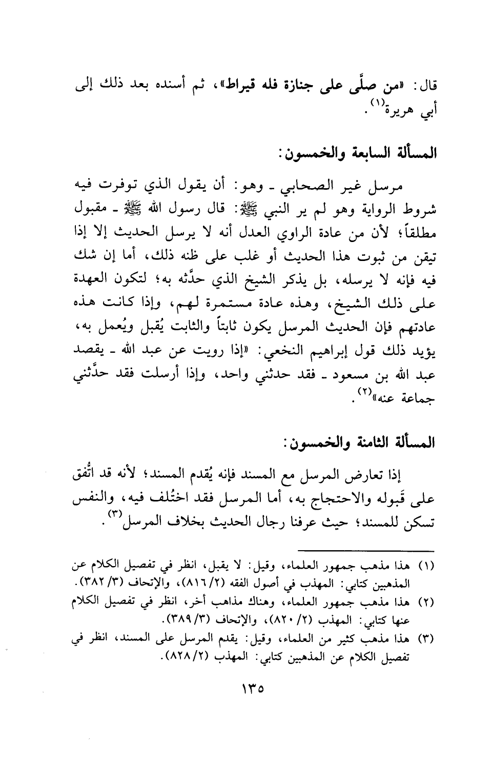 مرسل غير الصحابي - وهو: أن يقول الذي توفرت فيه شروط الرواية وهو لم ير النبي - صلى الله عليه وسلم -: قال رسول الله - صلى الله عليه وسلم -- مقبول مطلقاً؛ لأن من عادة الراوي العدل أنه لا يرسل الحديث إلا إذا تيقن من ثبوت هذا الحديث أو غلب على ظنه ذلك، أما إن شك فيه فإنه لا يرسله، بل يذكر الشيخ الذي حدثه به؛ لتكون العهدة على ذلك الشيخ، وهذه عادة مستمرة لهم، وإذا كانت هذه عادتهم فإن الحديث المرسل يكون ثابتاً والثابت يُقبل وُيعمل به، يؤيد ذلك قول إبراهيم النخعي: " إذا رويت عن عبد الله - يقصد عبد الله بن مسعود - فقد حدثني واحد، وإذا أرسلت فقد حدَّثني جماعة عنه ".