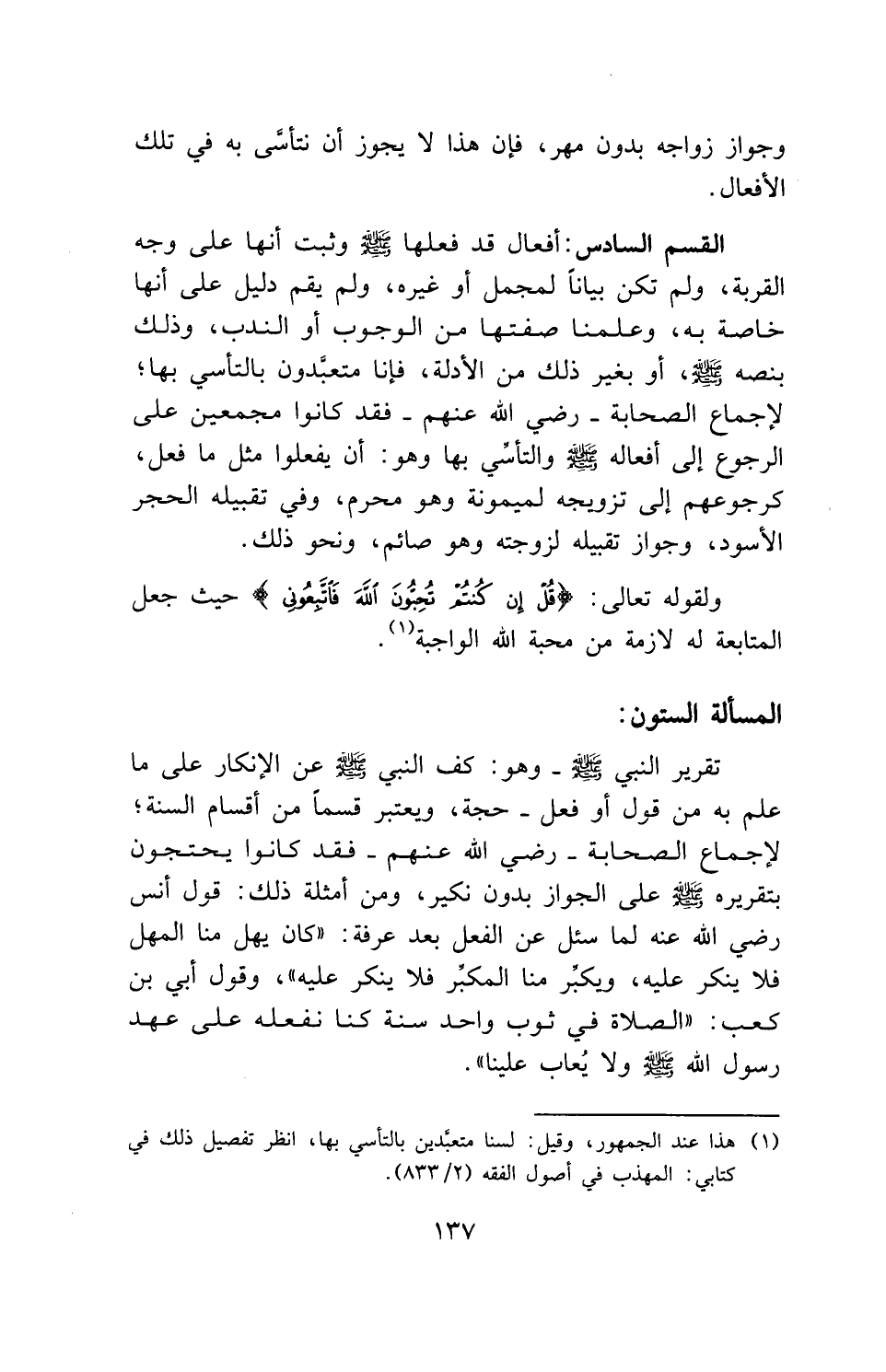 القسم السادس: أفعال قد فعلها - صلى الله عليه وسلم - وثبت أنها على وجه القربة، ولم تكن بياناً لمجمل أو غيره، ولم يقم دليل على أنها خاصة به، وعلمنا صفتها من الوجوب أو الندب، وذلك بنصه - صلى الله عليه وسلم -، أو بغير ذلك من الأدلة، فإنا متعبَّدون بالتأسي بها؛ لإجماع الصحابة - رضي الله عنهم - فقد كانوا مجمعين على الرجوع إلى أفعاله - صلى الله عليه وسلم - والتأسي بها وهو: أن يفعلوا مثل ما فعل، كرجوعهم إلى تزويجه لميمونة وهو محرم، وفي تقبيله الحجر الأسود، وجواز تقبيله لزوجته وهو صائم، ونحو ذلك.