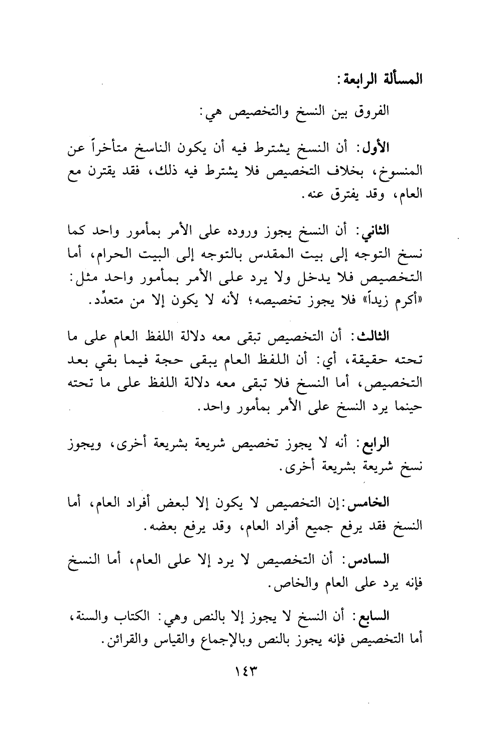 الخامس: إن التخصيص لا يكون إلا لبعض أفراد العام، أما النسخ فقد يرفع جميع أفراد العام، وقد يرفع بعضه.