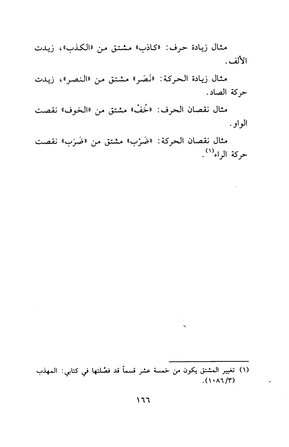 مثال زيادة حرف: " كاذب " مشتق من " الكذب "، زيدت الألف.