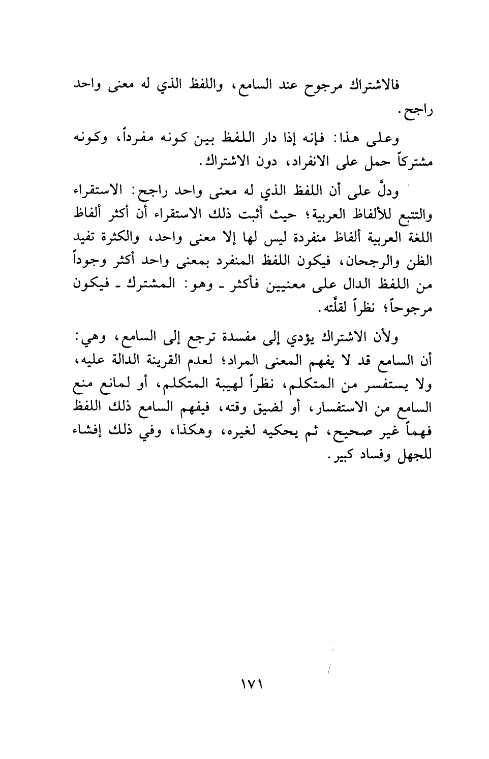 ولأن الاشتراك يؤدي إلى مفسدة ترجع إلى السامع، وهي: أن السامع قد لا يفهم المعنى المراد؛ لعدم القرينة الدالة عليه، ولا يستفسر من المتكلم، نظراً لهيبة المتكلم، أو لمانع منع السامع من الاستفسار، أو لضيق وقته، فيفهم السامع ذلك اللفظ فهماً غير صحيح، ثم يحكيه لغيره، وهكذا، وفي ذلك إفشاء للجهل وفساد كبير.