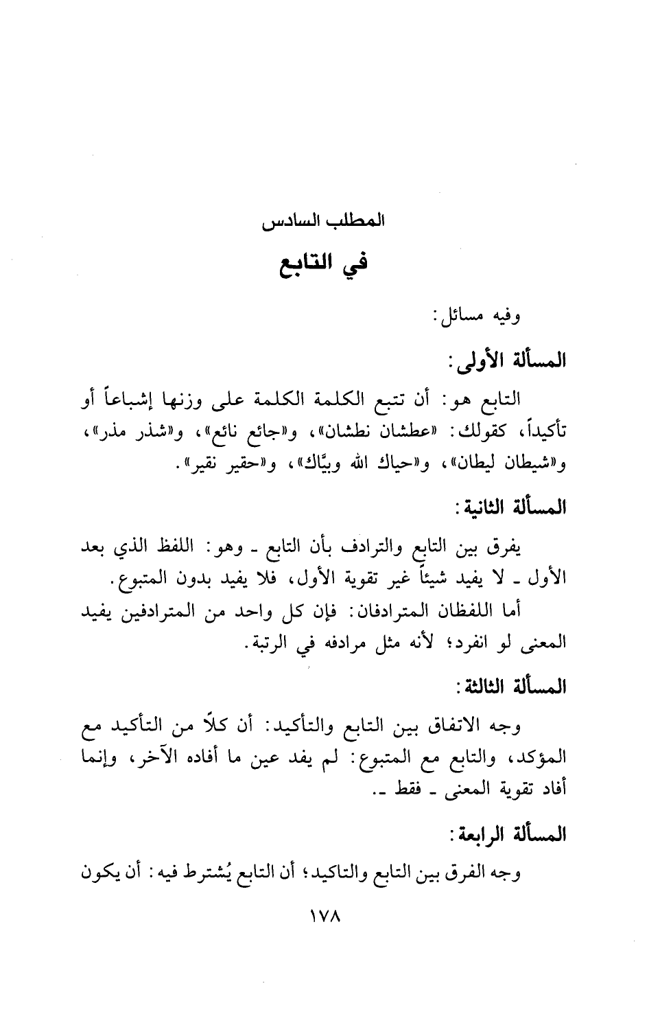 التابع هو: أن تتبع الكلمة الكلمة على وزنها إشباعاً أو تأكيداً، كقولك: " عطشان نطشان "، و " جائع نائع "، و " شذر مذر "، و" شيطان ليطان "، و " حياك الله وبياك "، و " حقير نقير ".