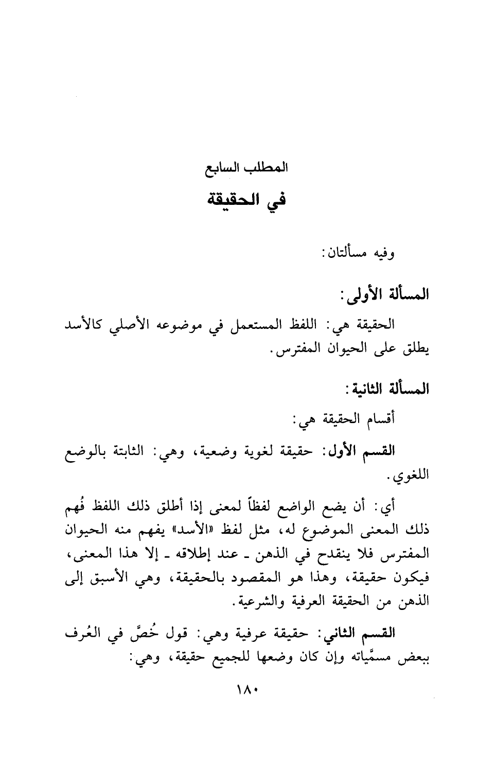 الحقيقة هي: اللفظ المستعمل في موضوعه الأصلي كالأسد يطلق على الحيوان المفترس.