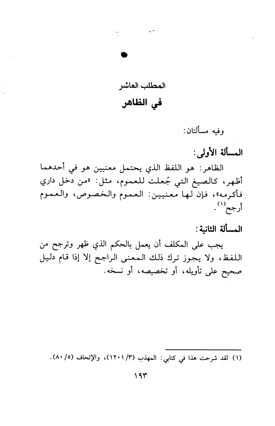 الظاهر: هو اللفظ الذي يحتمل معنيين هو في أحدهما أظهر، كالصيغ التي جُعلت للعموم، مثل: " مَن دخل داري فأكرمه "، فإن لها معنيين: العموم والخصوص، والعموم أرجح.