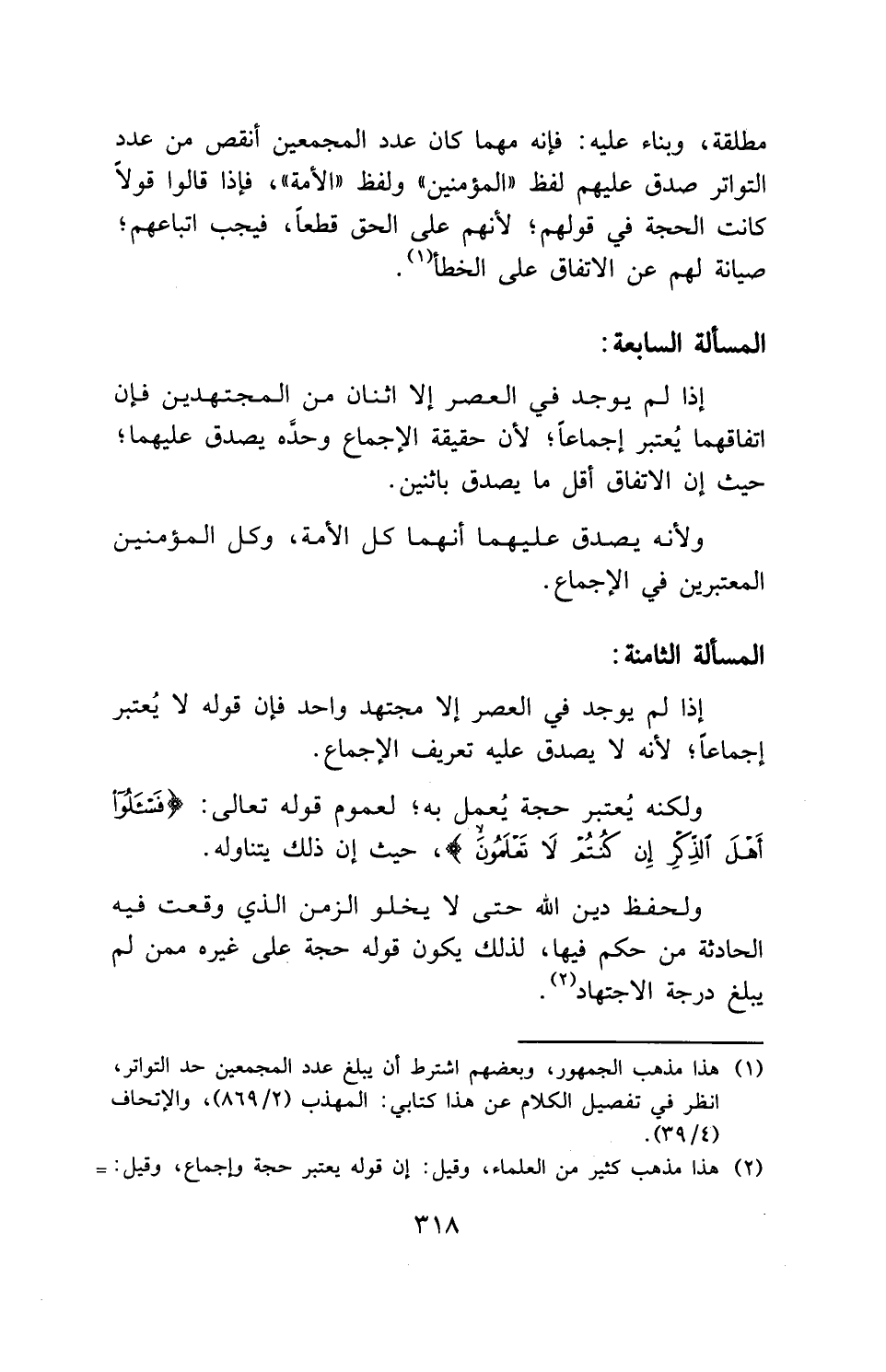 مطلقة، وبناء عليه: فإنه مهما كان عدد المجمعين أنقص من عدد التواتر صدق عليهم لفظ " المؤمنين " ولفظ " الأمة "، فإذا قالوا قولاً كانت الحجة في قولهم، لأنهم على الحق قطعاً، فيجب اتباعهم؛ صيانة لهم عن الاتفاق على الخطأ.