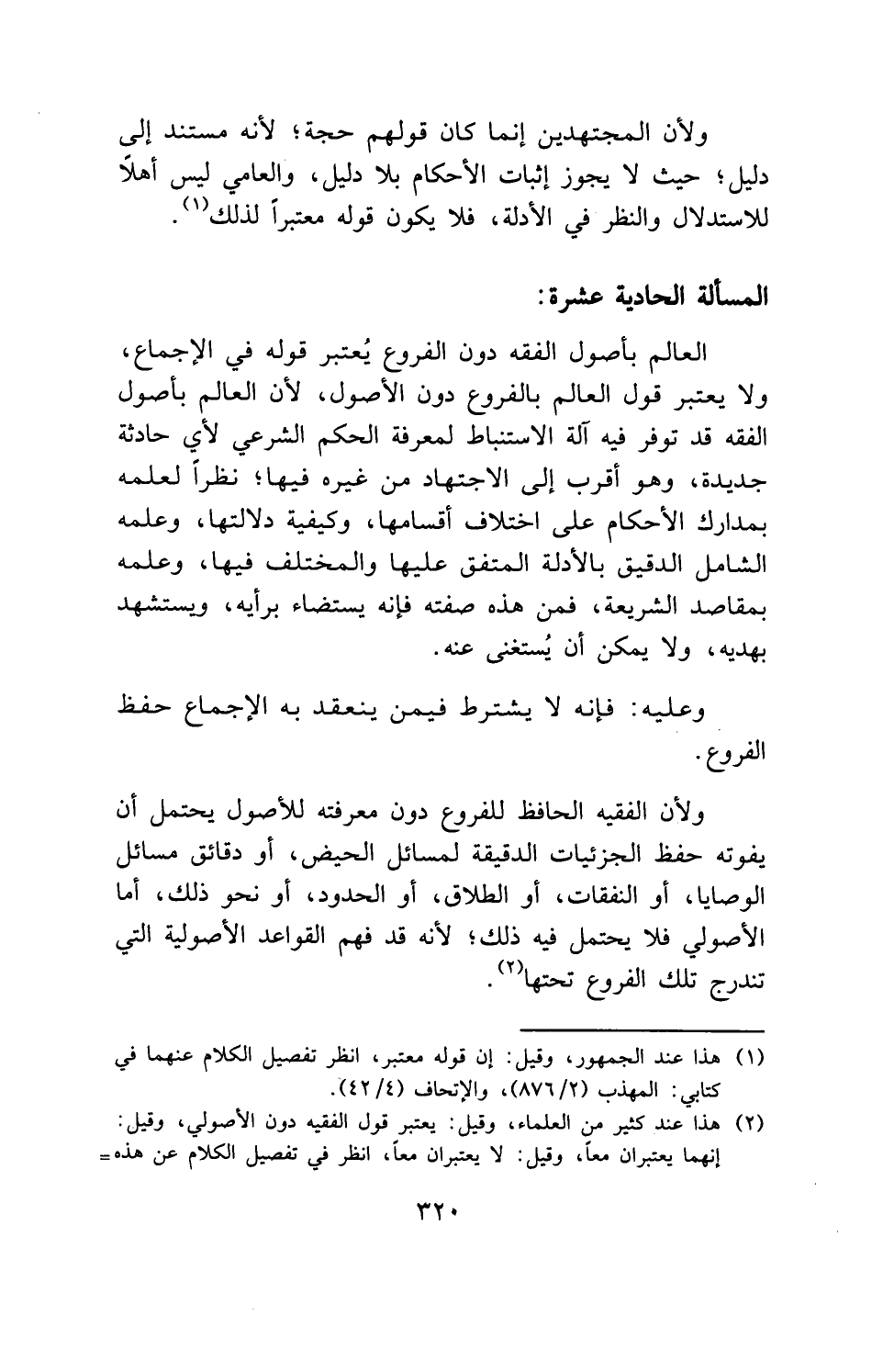 العالم بأصول الفقه دون الفروع يُعتبر قوله في الإجماع، ولا يعتبر قول العالم بالفروع دون الأصول، لأن العالم بأصول الفقه قد توفر فيه آلة الاستنباط لمعرفة الحكم الشرعي لأي حادثة جديدة، وهو أقرب إلى الاجتهاد من غيره فيها؛ نظراً لعلمه بمدارك الأحكام على اختلاف أقسامها، وكيفية دلالتها، وعلمه الشامل الدقيق بالأدلة المتفق عليها والمختلف فيها، وعلمه بمقاصد الشريعة، فمن هذه صفته فإنه يستضاء برأيه، ويستشهد بهديه، ولا يمكن أن يُستغنى عنه.