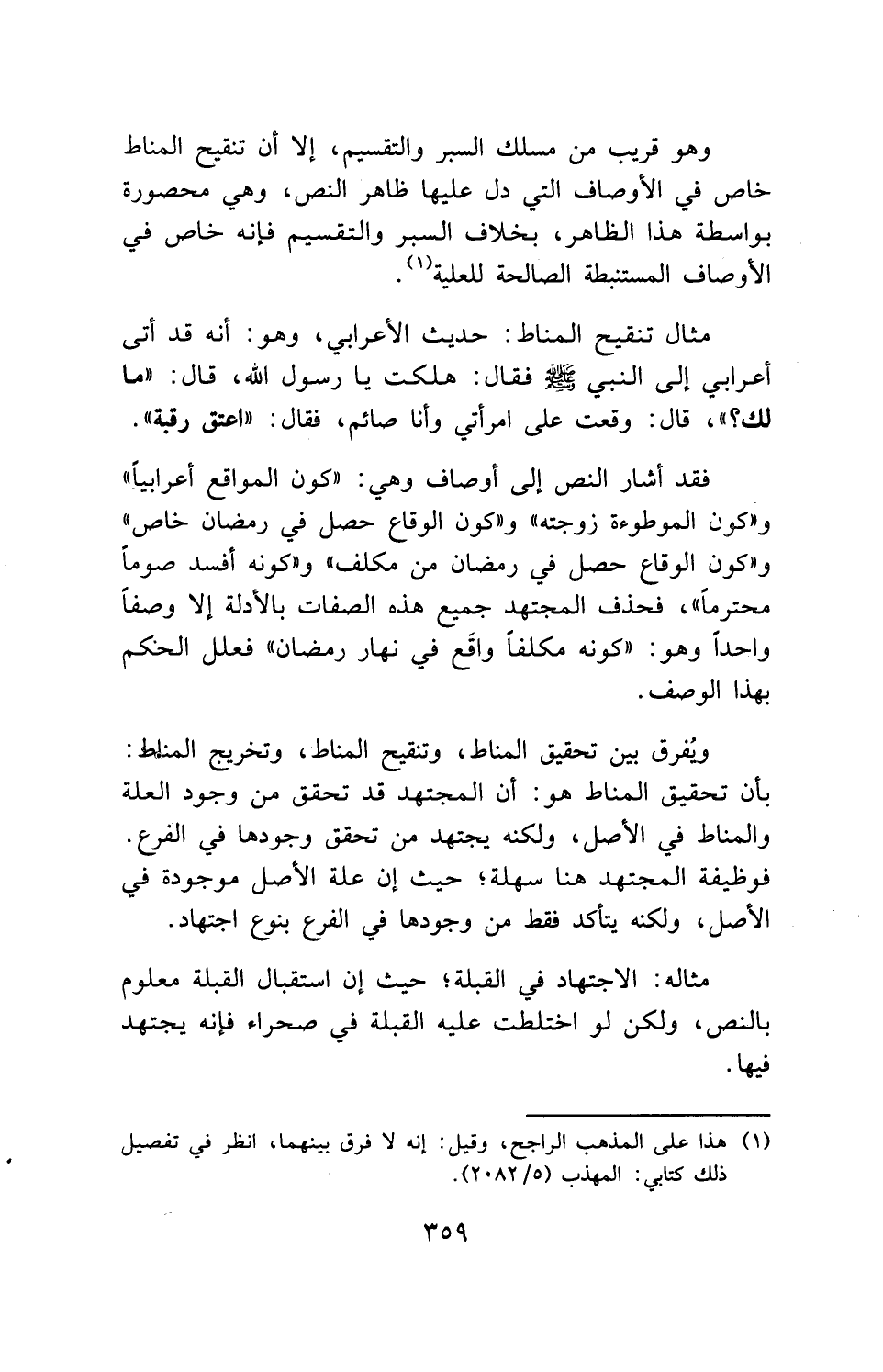 فقد أشار النص إلى أوصاف وهي: " كون المواقع أعرابيا " و " كون الموطوءة زوجته " و " كون الوقاع حصل في رمضان خاص " و " كون الوقاع حصل في رمضان من مكلف " و " كونه أفسد صوماً محترماً "، فحذف المجتهد جميع هذه الصفات بالأدلة إلا وصفاً واحداً وهو: " كونه مكلفاً واقَع في نهار رمضان " فعلل الحكم بهذا الوصف.