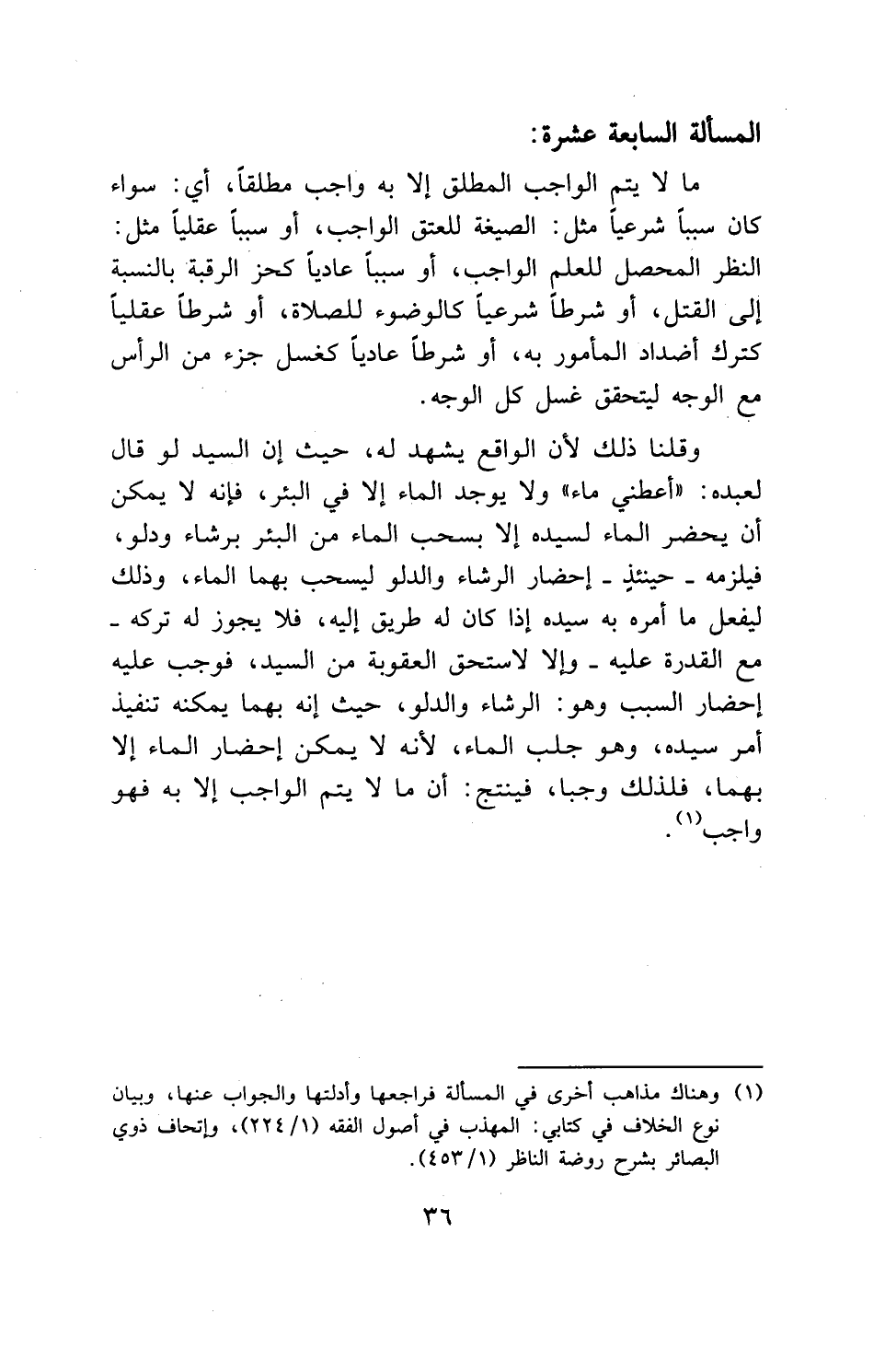 ما لا يتم الواجب المطلق إلا به واجب مطلقاً، أي: سواء كان سبباً شرعياً مثل: الصيغة للعتق الواجب، أو سبباً عقلياً مثل: النظر المحصل للعلم الواجب، أو سبباً عادياً كحز الرقبة بالنسبة إلى القتل، أو شرطاً شرعياً كالوضوء للصلاة، أو شرطاً عقلياً كترك أضداد المأمور به، أو شرطاً عادياً كغسل جزء من الرأس مع الوجه ليتحقق غسل كل الوجه.