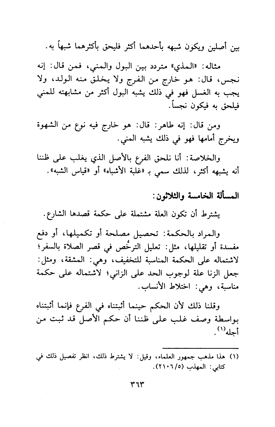 مثاله: " المذي " متردد بين البول والمني، فمن قال: إنه نجس، قال: هو خارج من الفرج ولا يخلق منه الولد، ولا يجب به الغسل فهو في ذلك يشبه البول أكثر من مشابهته للمني فيلحق به فيكون نجساً.