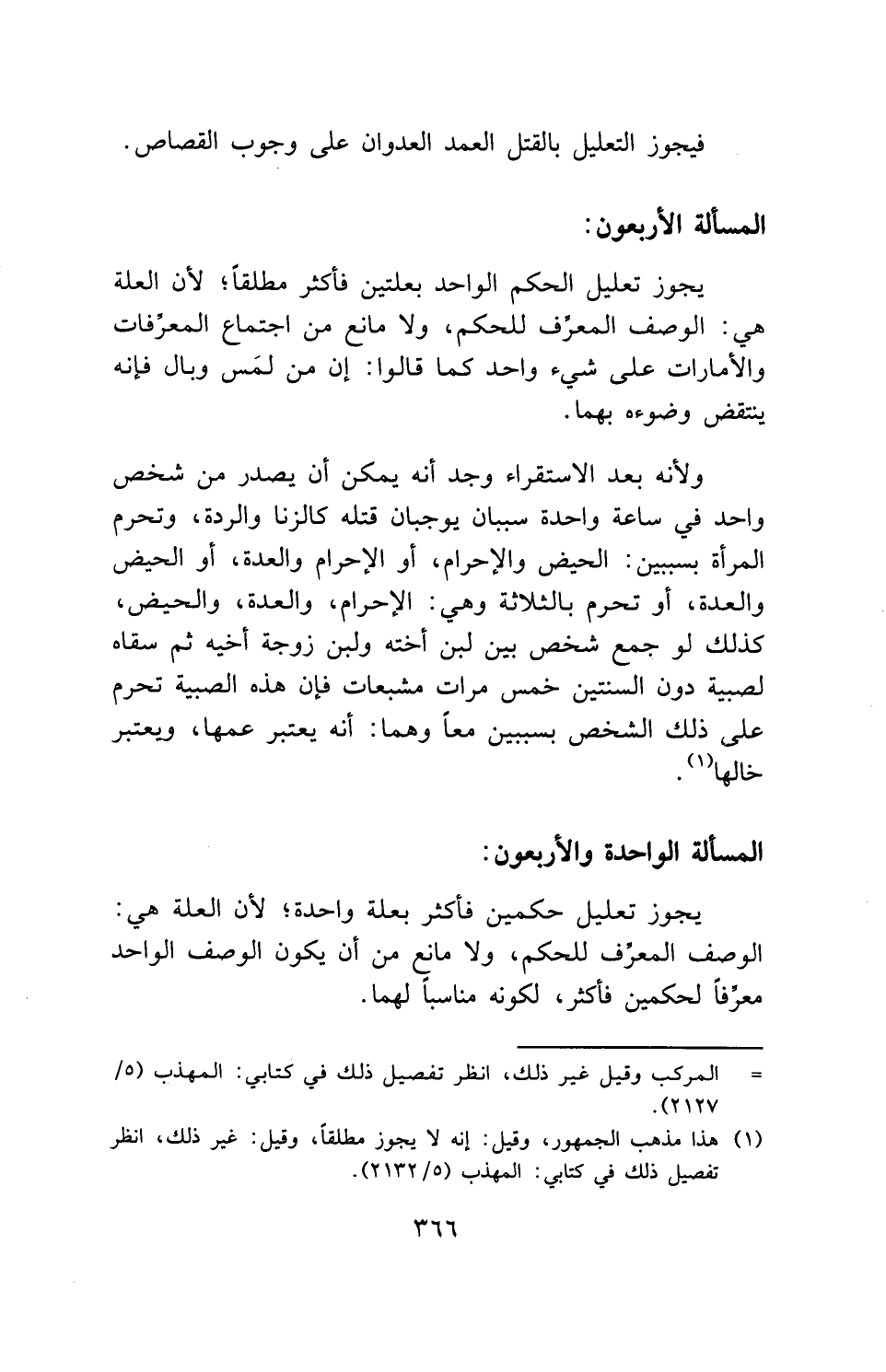 ولأنه بعد الاستقراء وجد أنه يمكن أن يصدر من شخص واحد في ساعة واحدة سببان يوجبان قتله كالزنا والردة، وتحرم المرأة بسببين: الحيض والإحرام، أو الإحرام والعدة، أو الحيض والعدة، أو تحرم بالثلاثة وهي: الإحرام، والعدة، والحيض، كذلك لو جمع شخص بين لبن أخته ولبن زوجة أخيه ثم سقاه لصبية دون السنتين خمس مرات مشبعات فإن هذه الصبية تحرم على ذلك الشخص بسببين معاً وهما: أنه يعتبر عمها، ويعتبر خالها.