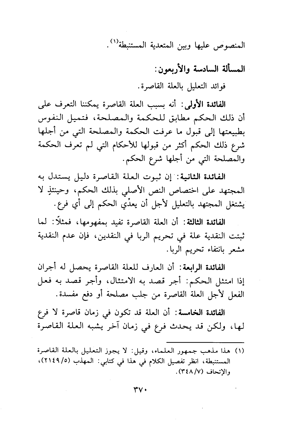 الفائدة الخامسة: أن العلة قد تكون في زمان قاصرة لا فرع لها، ولكن قد يحدث فرع في زمان آخر يشبه العلة القاصرة