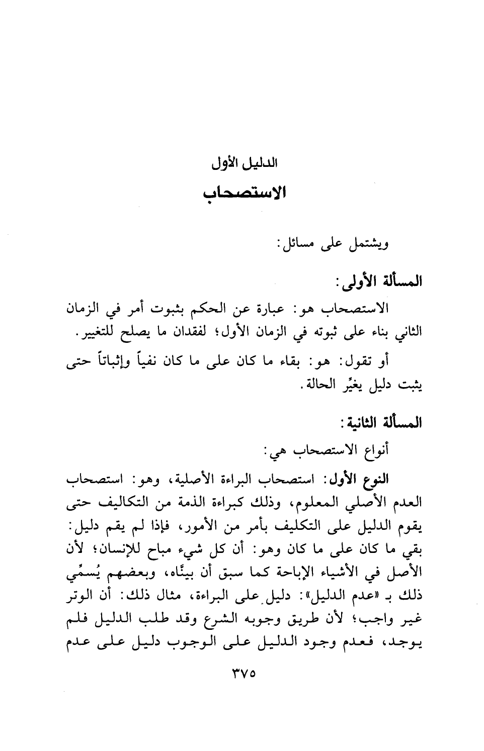 النوع الأول: استصحاب البراءة الأصلية، وهو: استصحاب العدم الأصلي المعلوم، وذلك كبراءة الذمة من التكاليف حتى يقوم الدليل على التكليف بأمر من الأمور، فإذا لم يقم دليل: بقي ما كان على ما كان وهو: أن كل شيء مباح للإنسان؛ لأن الأصل في الأشياء الإباحة كما سبق أن بيناه، وبعضهم يُسمي ذلك بـ " عدم الدليل ": دليل على البراءة، مثال ذلك: أن الوتر غير واجب؛ لأن طريق وجوبه الشرع وقد طلب الدليل فلم يوجد، فعدم وجود الدليل على الوجوب دليل على عدم